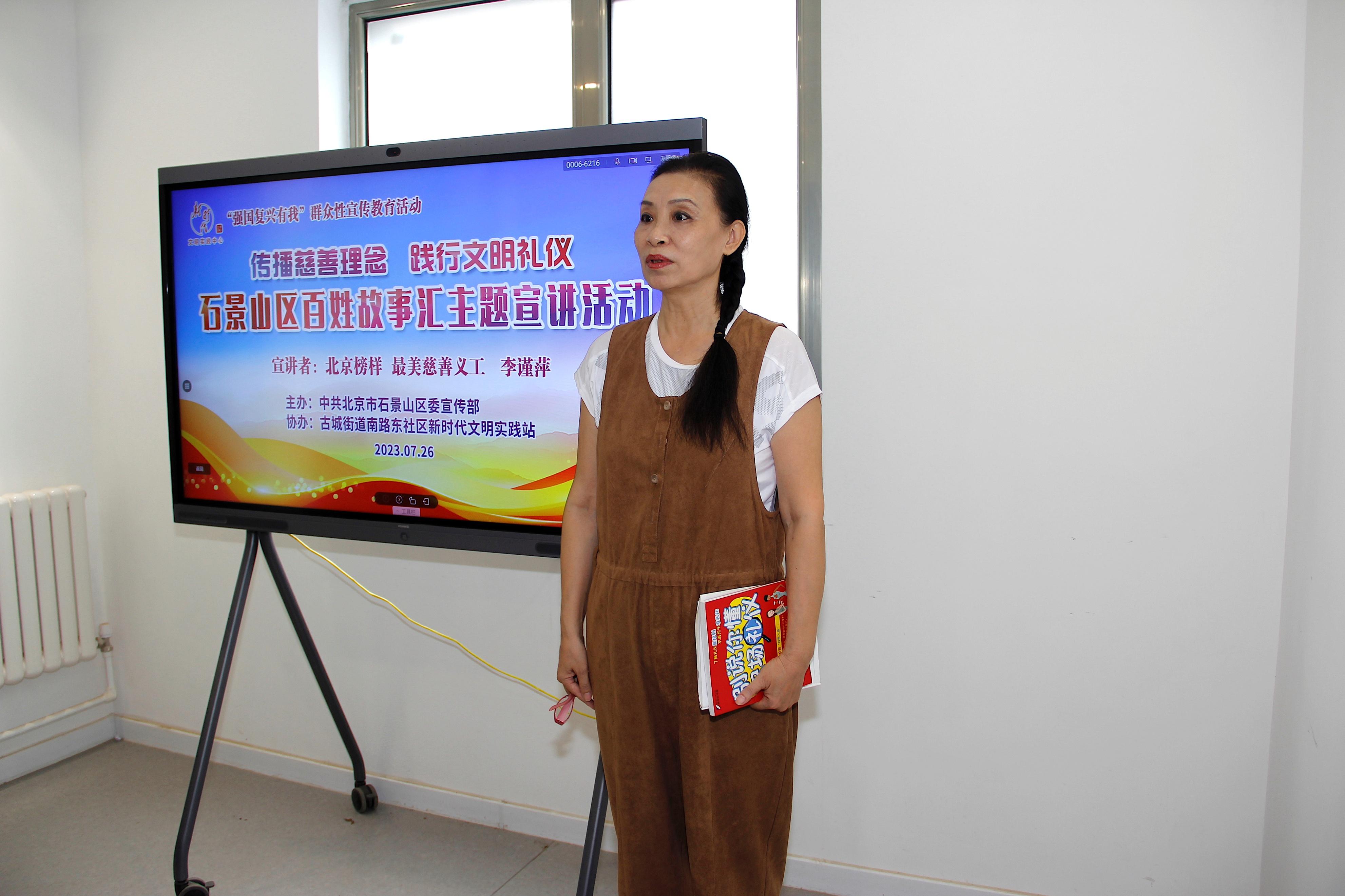 7月26日下午,中共石景山区委宣传部,邀请北京榜样、最美慈善义工李谨萍,来到在古城街道南路东社区新时代文明实践站,进行一场别开生面的文明礼仪主题宣讲活动。李谨萍作为北京市慈善义工联合会“爱心”礼仪队队长,通过讲述自己亲身经历的慈善公益故事,旨在传播慈善理念,践行义工精神。