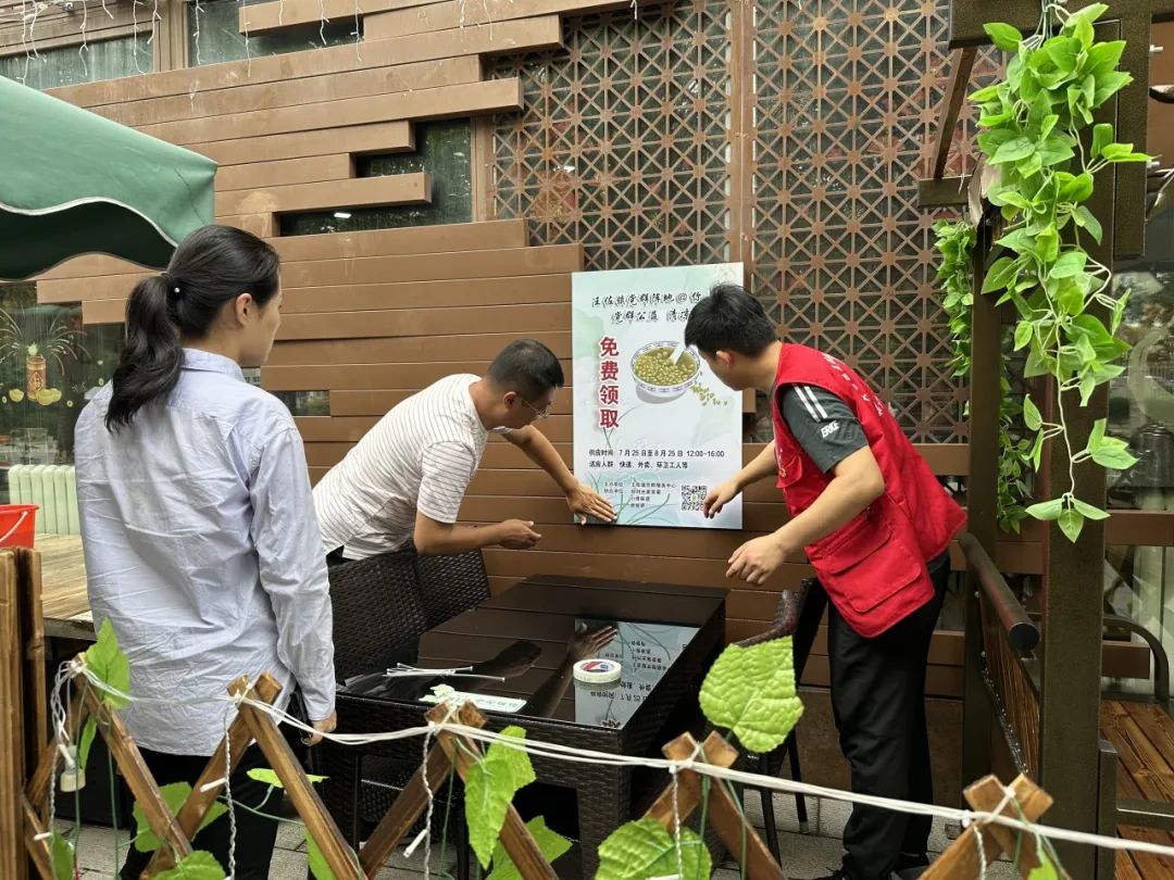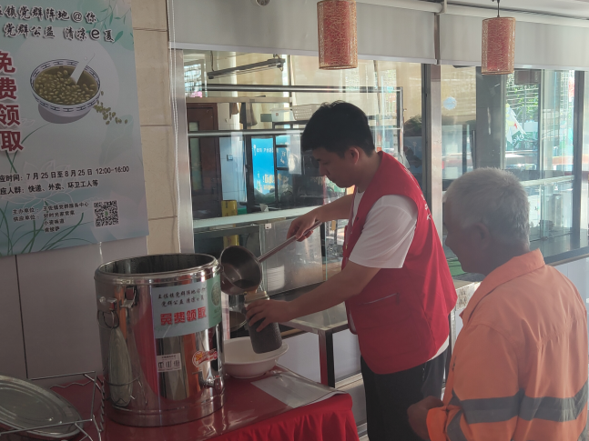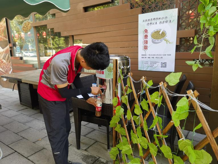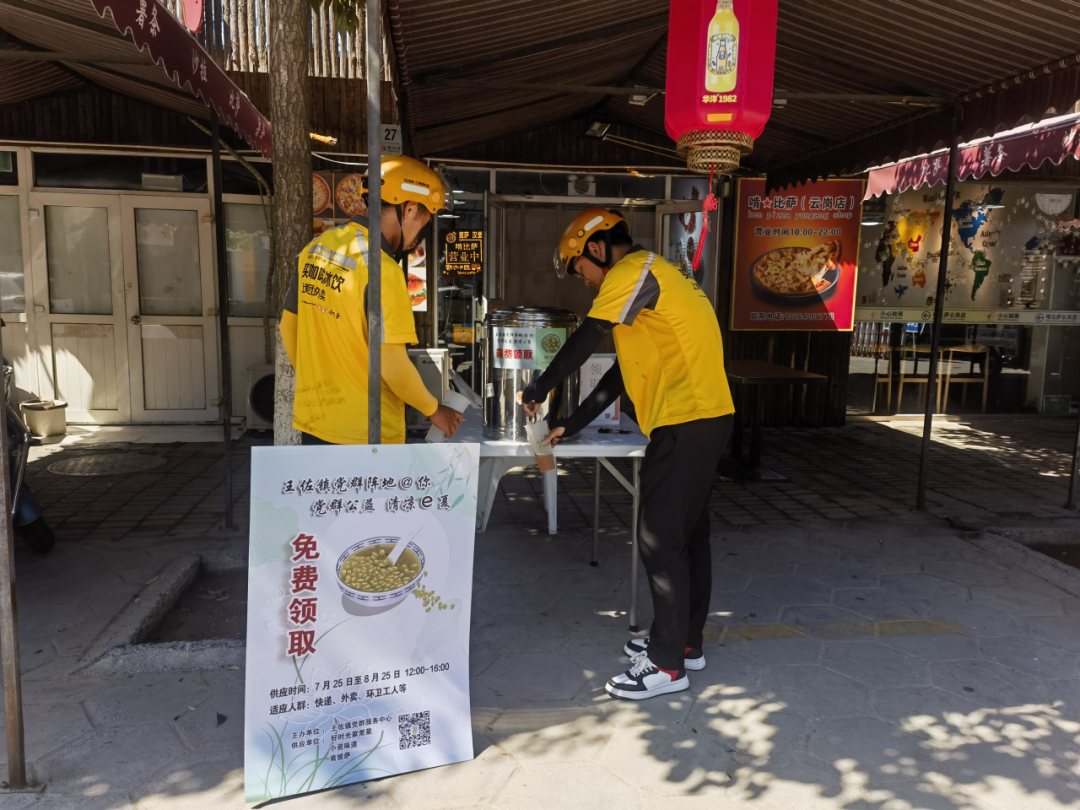 “您好,从今天起到8月25日,我们会在这里为您提供免费的绿豆汤与解暑药,您每天可以到这里来领取。”活动现场,工作人员引导外卖小哥、快递小哥领取夏日“专属”福利,为烈日下工作的劳动者们提供了一处休息场所,缓解炎热与疲劳,给他们身心带来一丝清凉和甘甜。