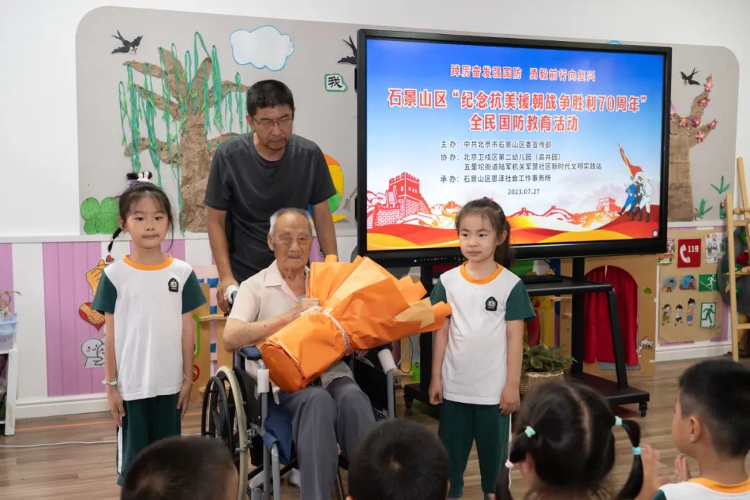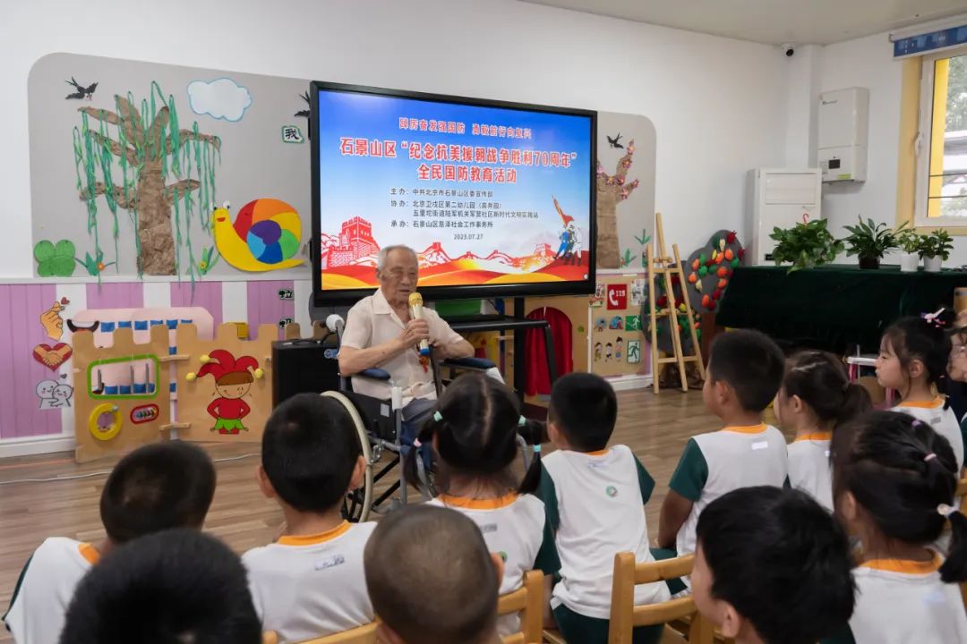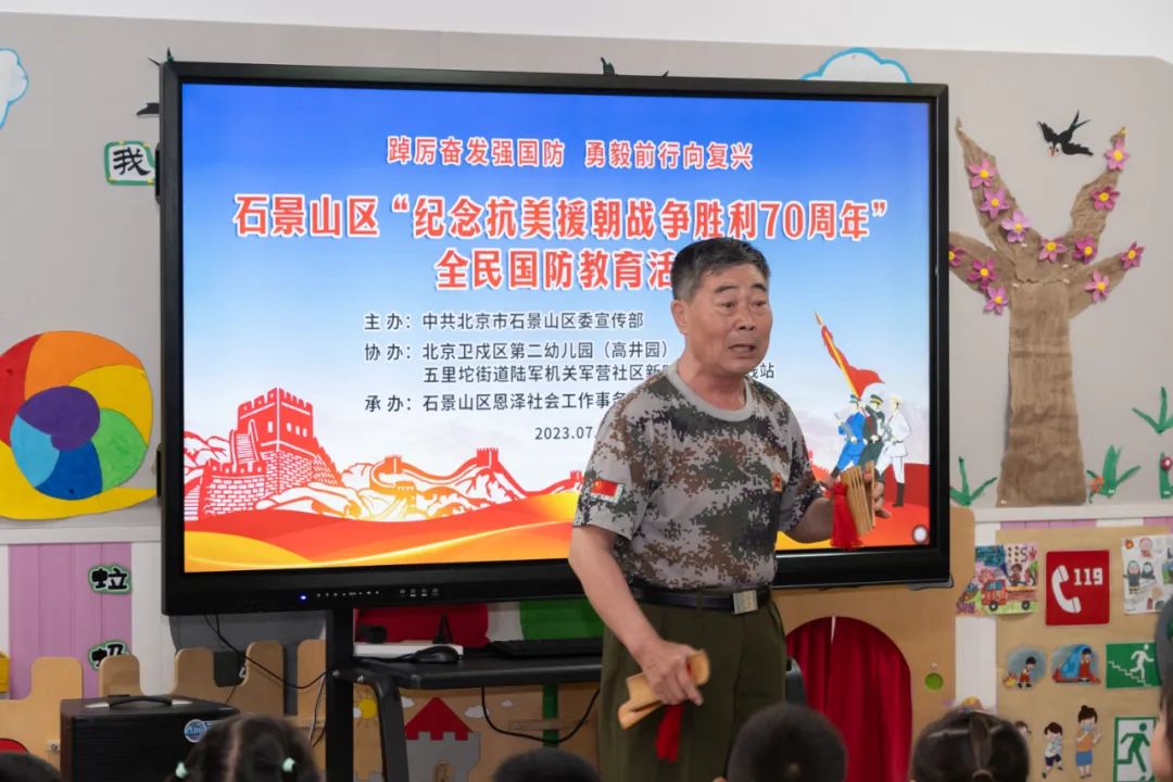 为纪念抗美援朝战争胜利70周年,7月27日下午,由中共石景山区委宣传部主办,北京卫戍区第二幼儿园(高井园)、五里坨街道陆军机关军营社区新时代文明实践站协办的“踔厉奋发强国防 勇毅前行向复兴”——纪念抗美援朝战争胜利70周年全民国防教育主题活动举办,军休干部、军地青年团员、幼儿园和社区学生等老、中、青、幼四代人代表参加活动。