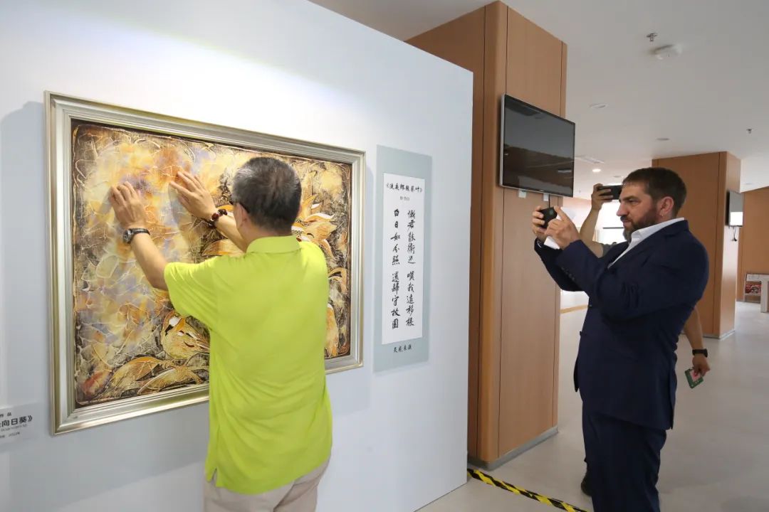“共享发展·筑梦同行”触摸画展选取白俄罗斯共和国荣誉画家曾科·瓦西里·瓦西里耶维奇《带点的诗-李白(2022)》系列作品,其创作灵感来源于中国唐代著名诗人李白的诗歌,每幅画作均为浮雕图像,将中国古诗和西方绘画完美融合,并在画作中加入中文盲文,构思巧妙、设计独到。本次画展的每一幅画作均单独配有中文语音讲解,让视障人士在聆听画作构图描述的同时,用指尖触摸画面上的诗文,立体地感受艺术之美,为残障人士开启一扇了解世界的艺术之窗,开辟了两区交流的新领域。