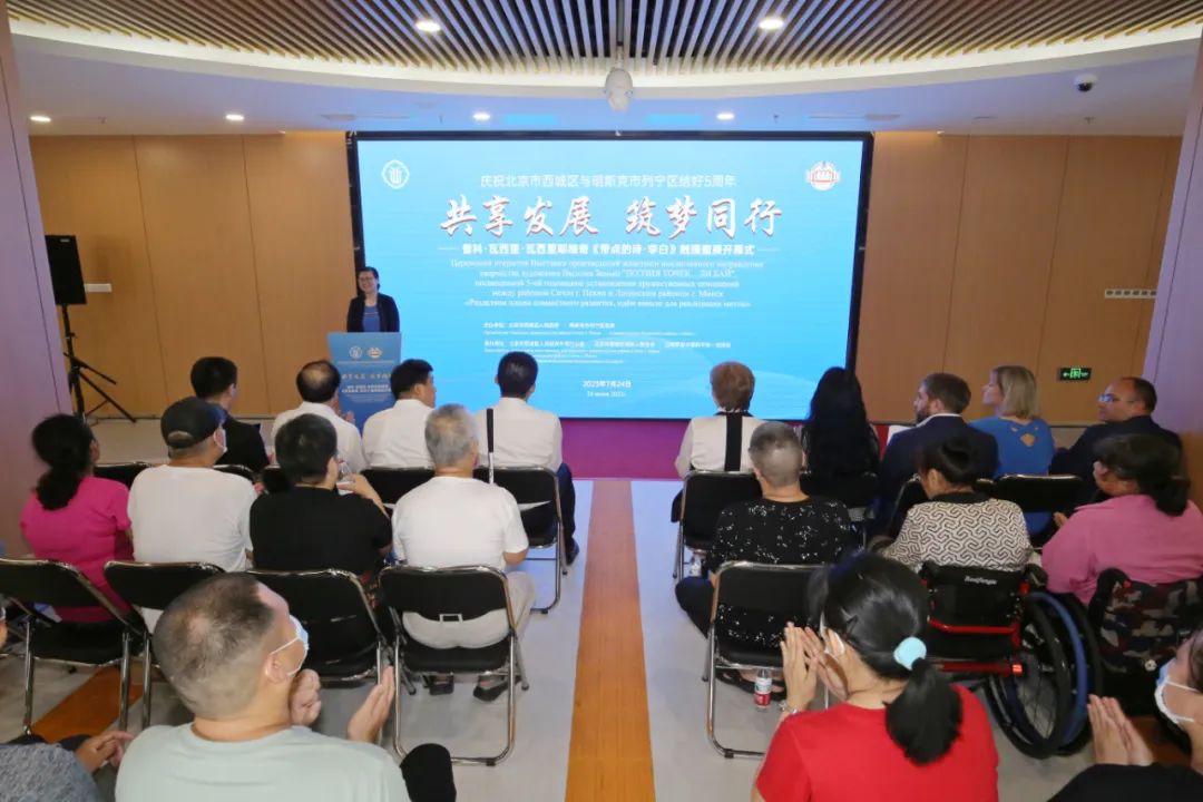7月24日,西城区与白俄罗斯明斯克市列宁区结好5周年庆祝活动暨“共享发展·筑梦同行”触摸画展开幕式在西城区残疾人联合会举行。当天,双方代表在区政府座谈交流,就在经贸、教育、演艺等领域的深入合作达成共识,并续签了两区友好交流备忘录。