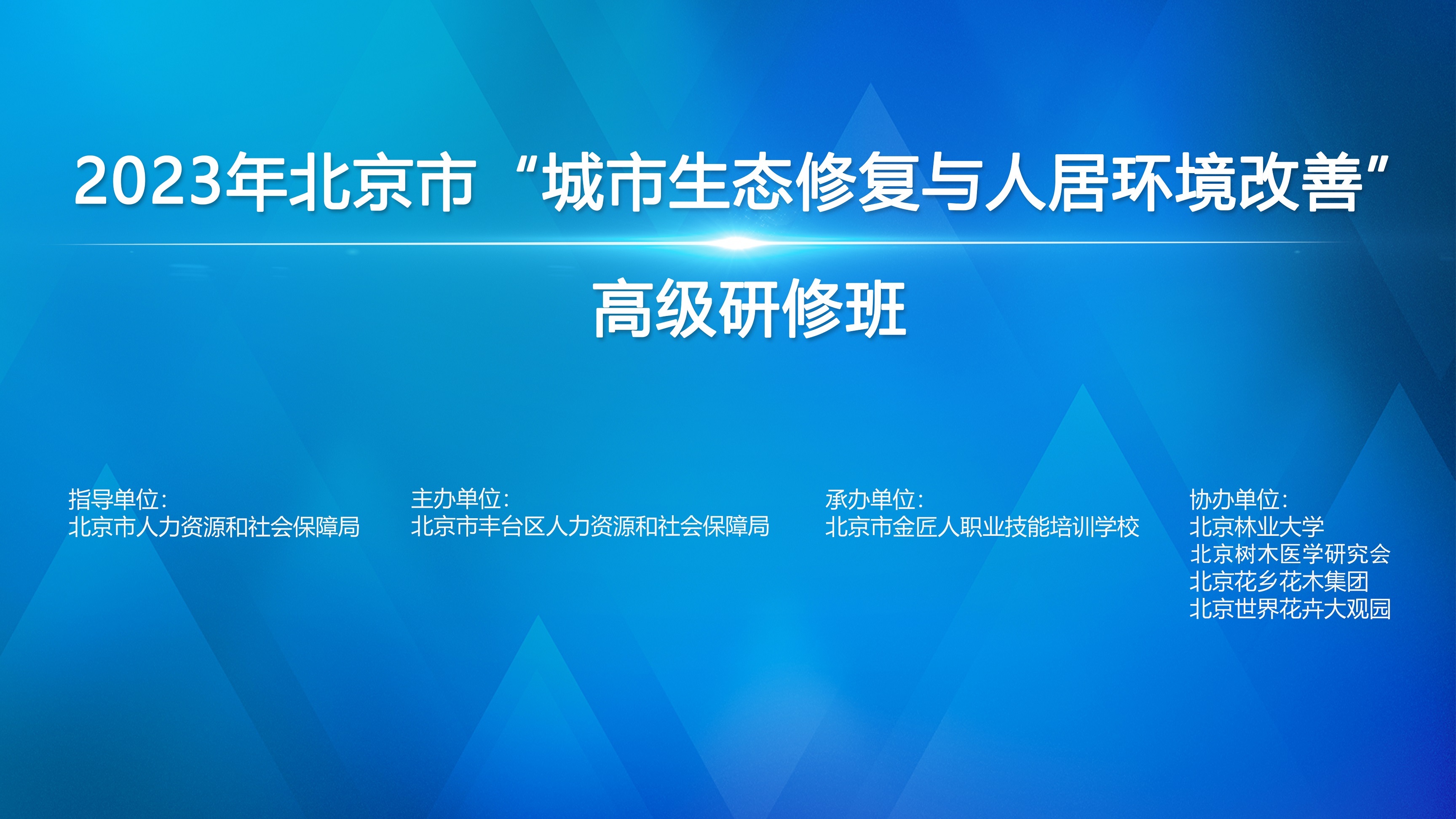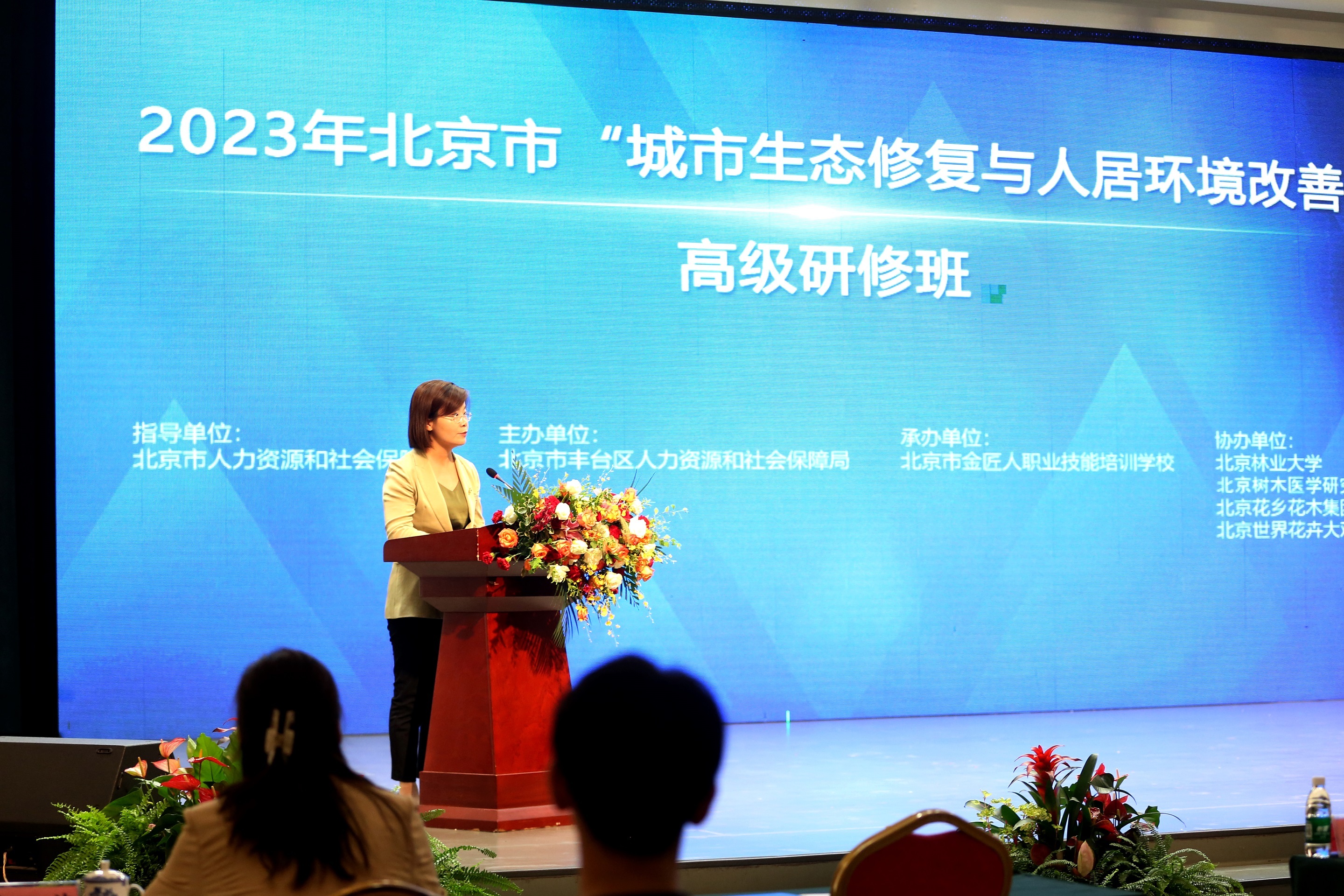 7月27日,在北京市人力资源和社会保障局指导下,由丰台区人力资源和社会保障局主办,北京市金匠人职业技能培训学校承办,北京林业大学、北京树木医学研究会、北京花乡花木集团、北京世界花卉大观园协办的2023年北京市“城市生态修复与人居环境改善”高级研修班在丰台草桥正式开班。