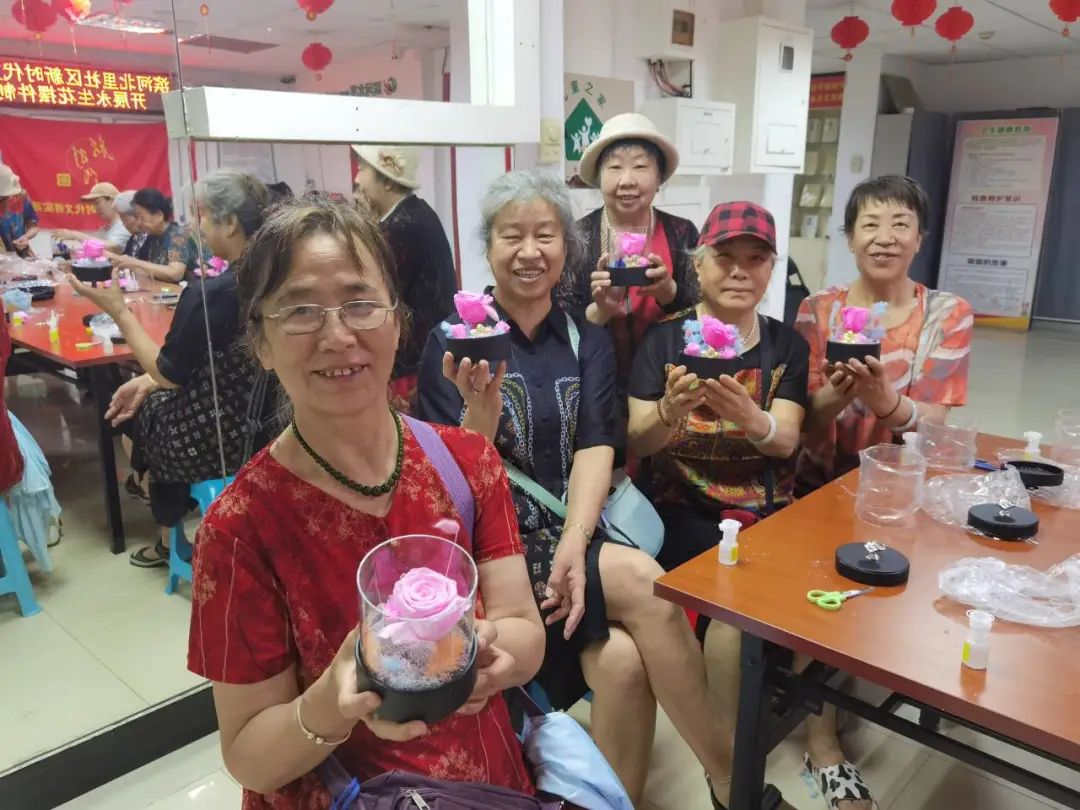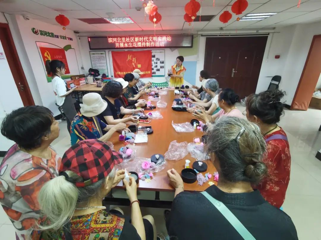 为丰富老年群体的精神文化生活,帮助她们走出家门、融入社区,7月26日,滨河北里社区组织开展永生花摆件制作活动,14名老人参与。