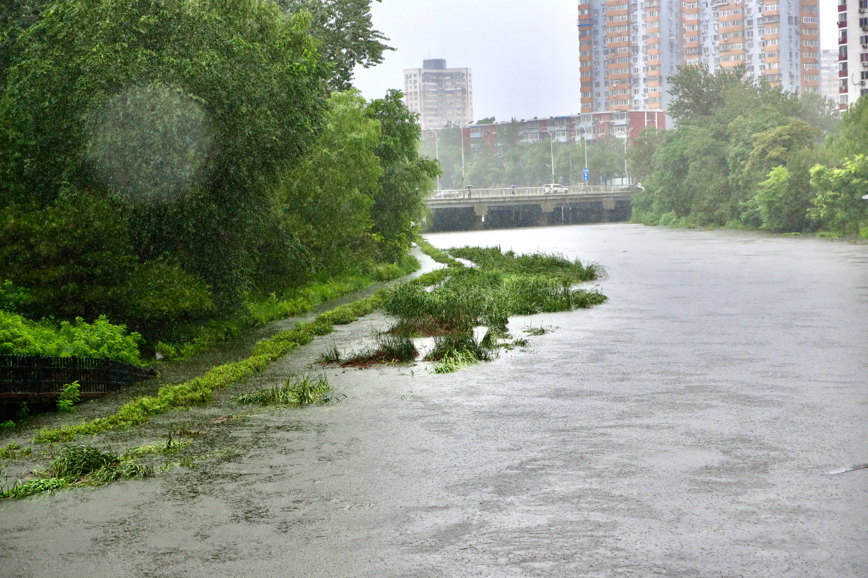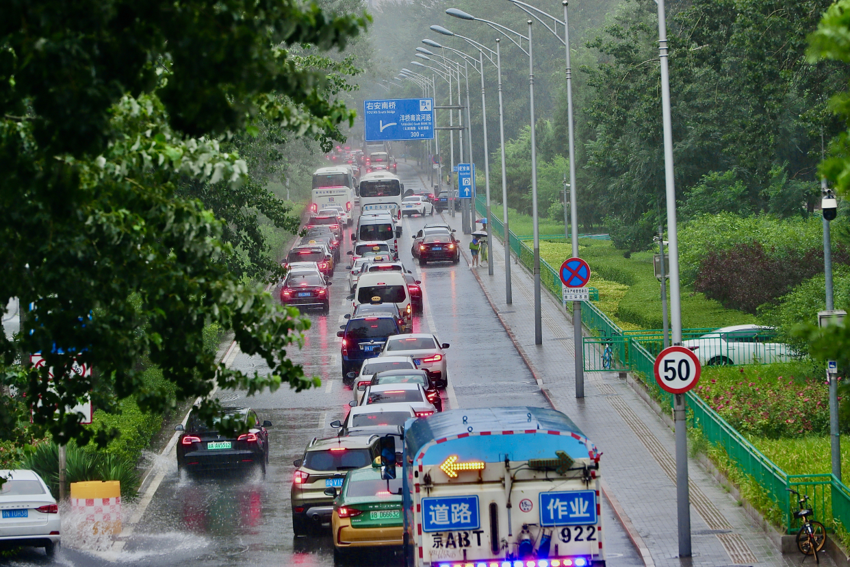 随后,记者一路向西,来到洋桥东侧,记者看到,凉水河的水面已经上涨了不少,两岸的步道被淹没了许多,出入口已临时关闭。洋桥以西的辅路车队出现了短暂的交通拥堵。记者发现,前往南站的车辆已经拥堵到南三环辅路,排队的车辆有一二百米长。车主有序排队,记者了解到,受暴雨影响,北京南站周边都出现了交通缓慢的情况。