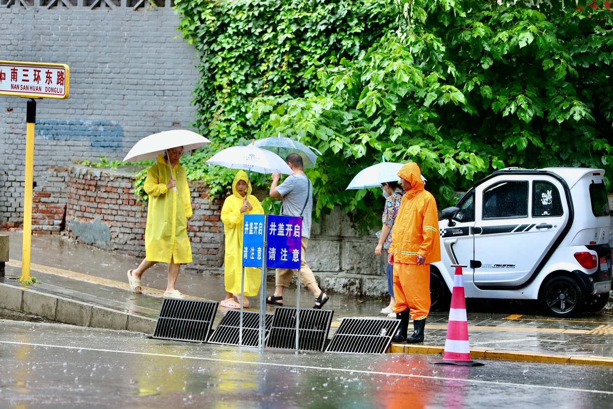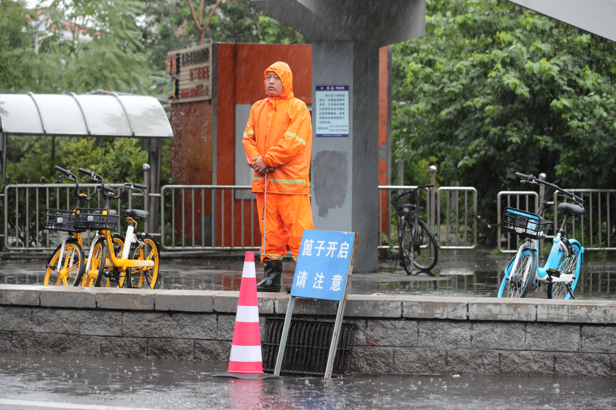 与民警一起坚守岗位的还有北京市排水集团的李先生,“凌晨三点左右我们就到岗了,设备和车辆同时到达,在低洼路段进行执勤,困了就在车上眯一会。”同时,记者还看到,路边的井盖已经打开,并有专门人值守,在井盖上方插着提醒行人的警示牌十分显眼。负责值守的李先生说:“雨势较大时,将会把井盖打开,方便雨水流入下水管道。目前来看雨势较大,但雨强相对平缓,并没有出现险情。”