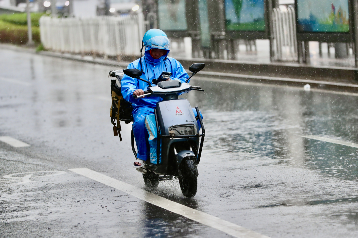 中午12点半,记者位于东铁营桥,雨势明显加大。随着三到四级风的吹动,可以明显看到倾斜雨柱。此时,自行车道上行驶最多的是外卖和快递员,为了准时送达他们穿着雨衣,减慢速度在自行车道穿梭。