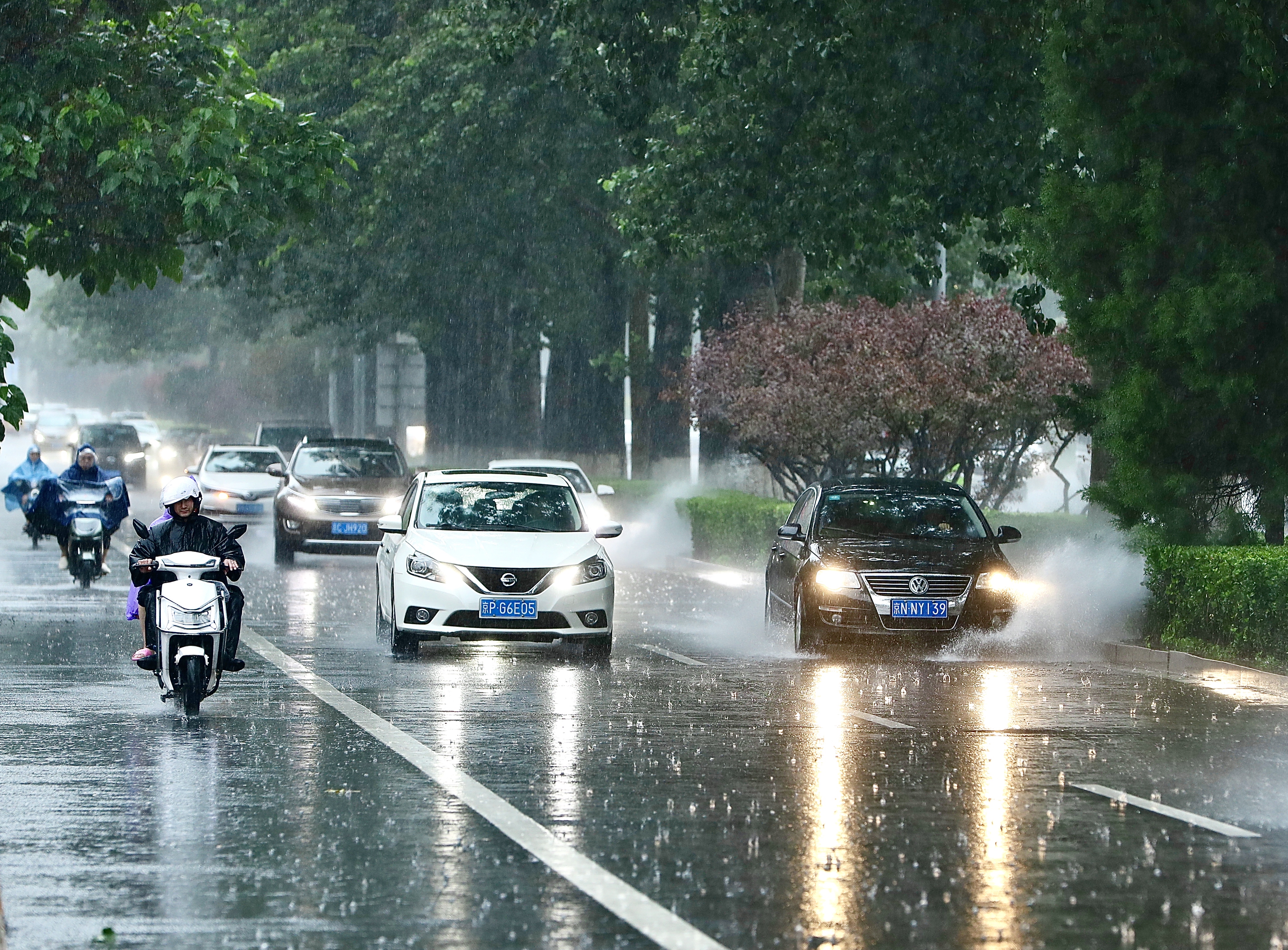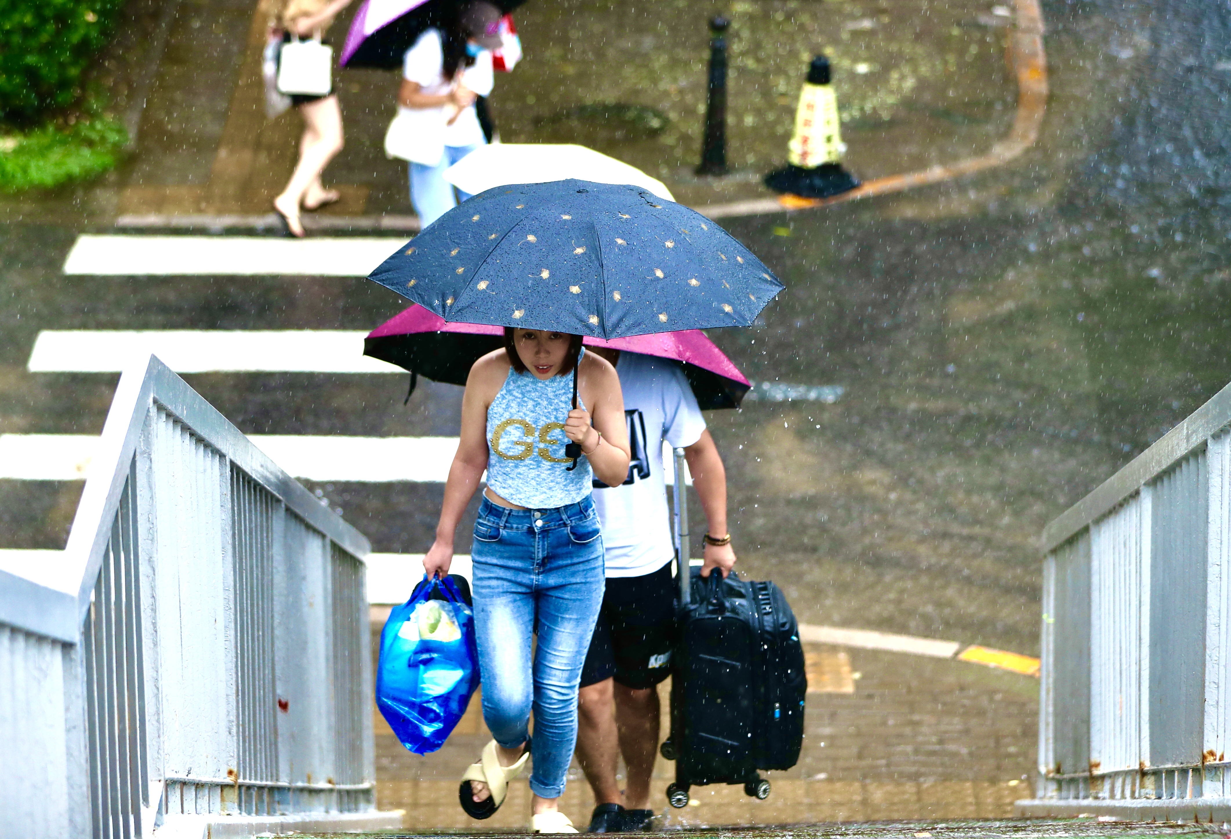 街上的行人多数也是如此,打伞多数是为了遮住头和上半身,下半身都已湿透。部分路人已经放弃了打伞,完全被淋湿,行人较常日明显偏少。记者观察到,路面低洼处会有,两到三厘米的积水,但并无大碍,出门的行人多数穿着拖鞋,方便涉水。