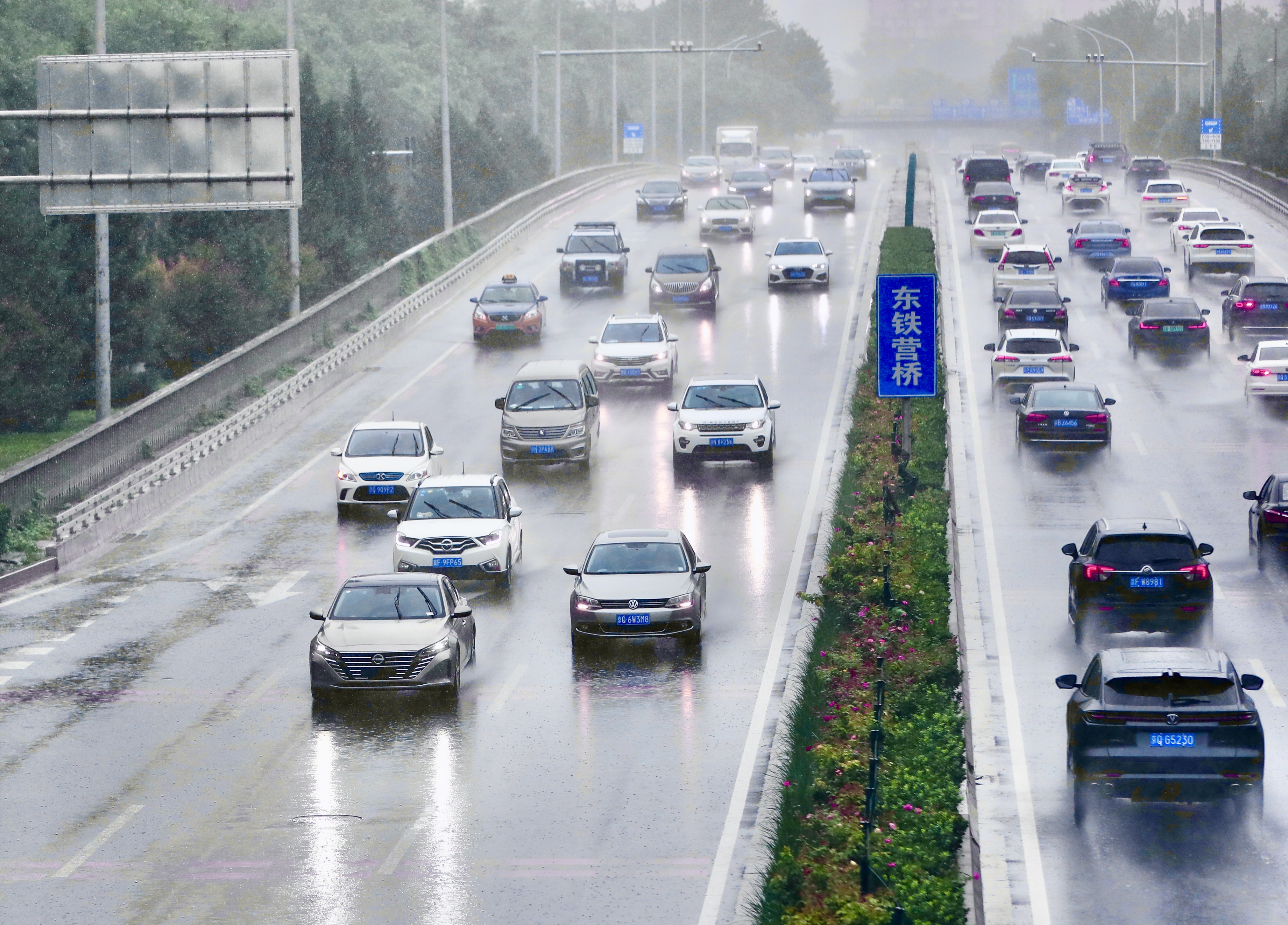记者从成寿寺桥出发,一路向西,刚一出门,大风带着暴雨,就将雨点打在记者身上,记者腰部以下衣服“秒湿”,为了保护采访设备只能顾及到上半身。