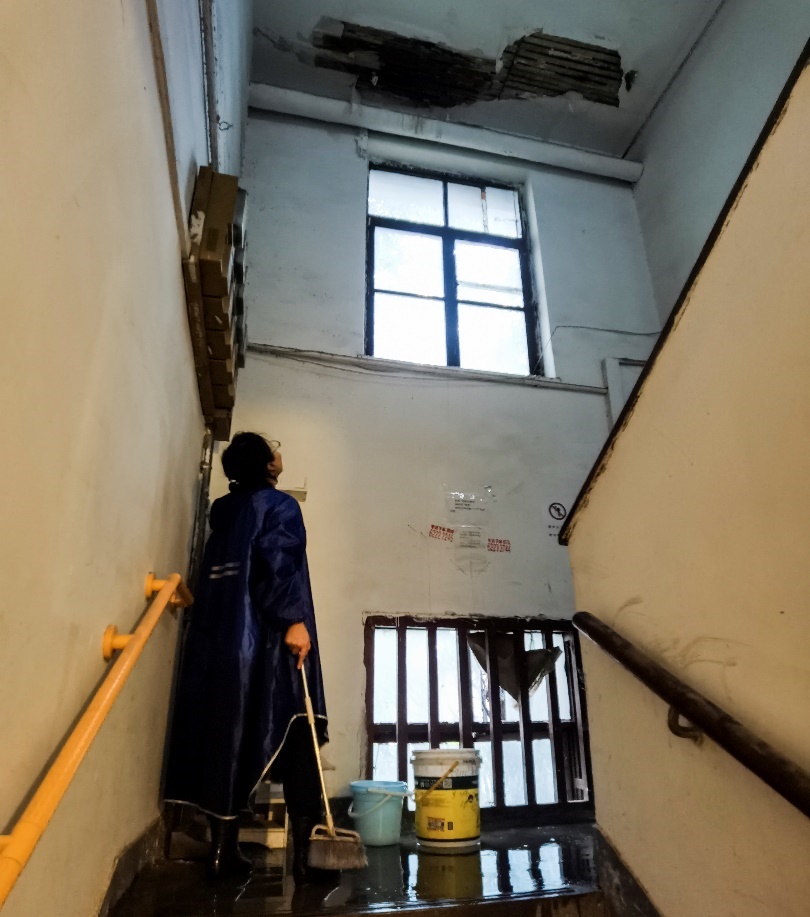 7月30日,阜外东社区接到居民反映阜外大街5号楼4单元楼道房顶漏雨的电话,社区书记马上与包片网格员和社区工作人员共同抵达现场查看情况。经查,发现楼道2层和4层楼道屋顶及侧窗有漏水点,雨水顺着漏点流入楼道。现场工作人员马上联系楼房产权单位反馈问题,同时清理楼道积水,并在漏雨处摆放水桶、水盆接水,防止雨水流入居民家中,并告知居民目前情况,安抚居民情绪。