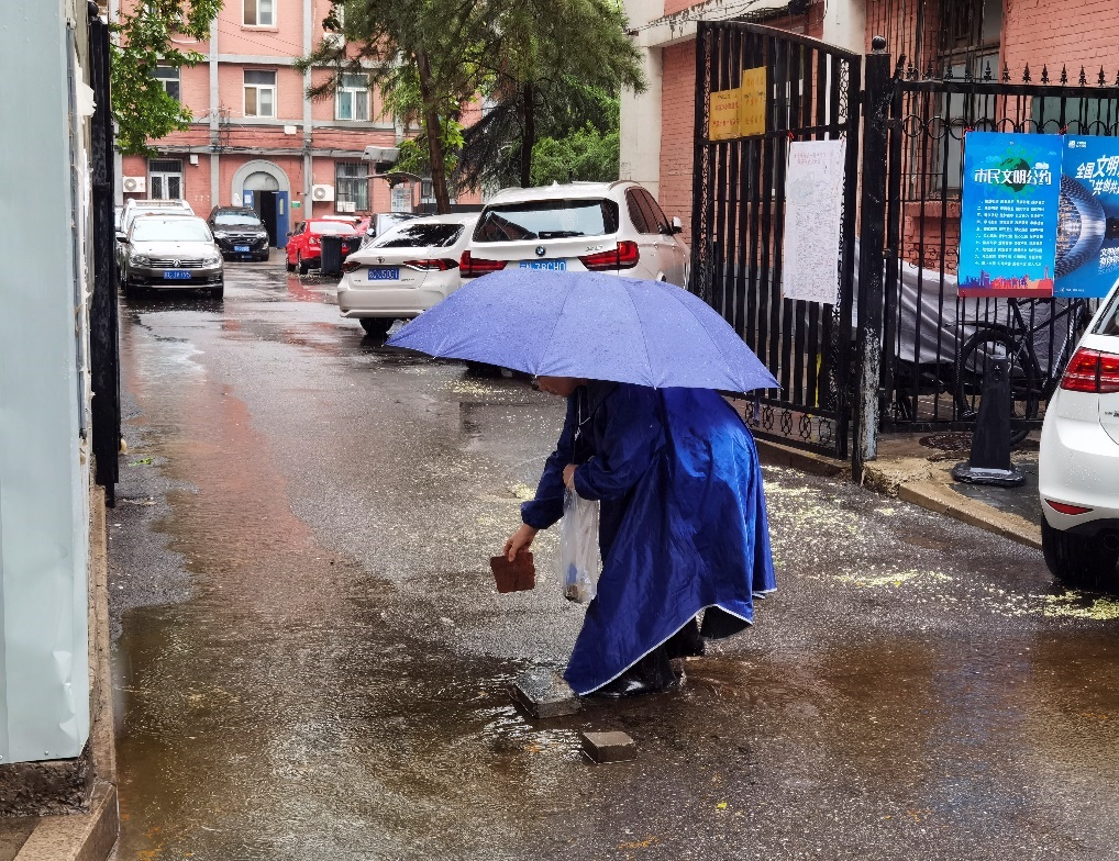 社区党委书记程皎婕:阜外东社区老旧小区较多,随着雨量的增大,辖区出现多处大面积积水。针对积水问题,社区根据居民出行情况,首先对小区重要通道,人工疏通雨水井和清理杂草;二是通过“西城家园”、微信群等网络渠道,呼吁居民减少出行,发现问题及时联系社区;三是对已经存在漏雨的点位进行回头看,清理多余积水,持续应对汛情。