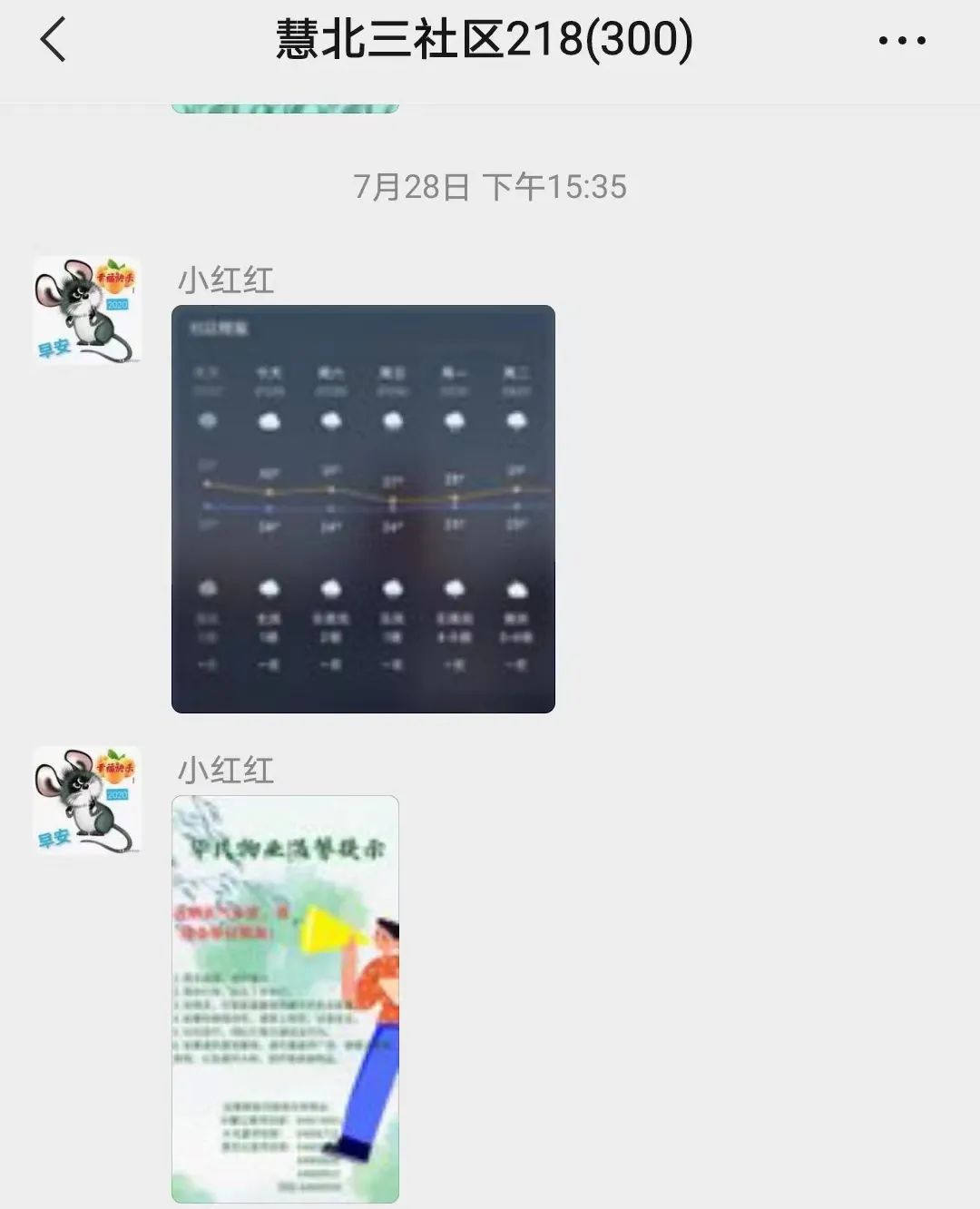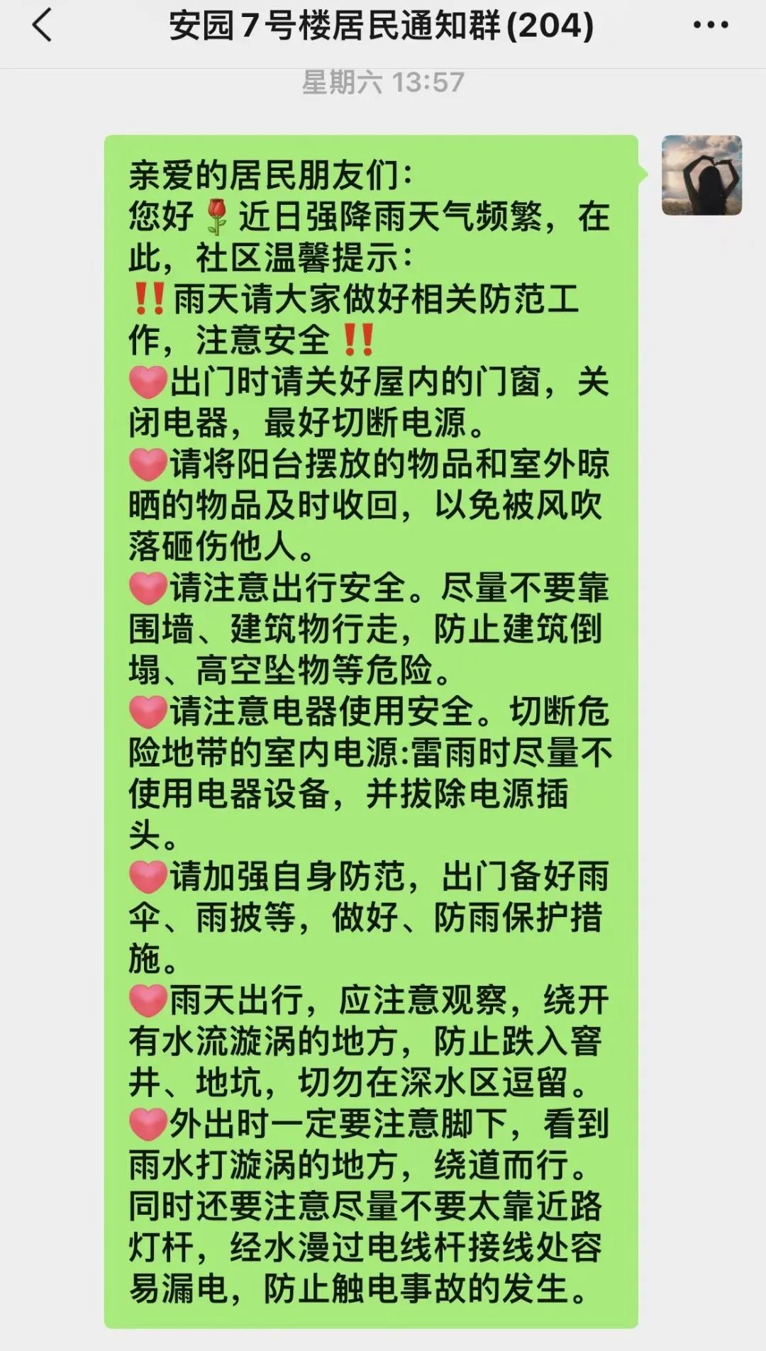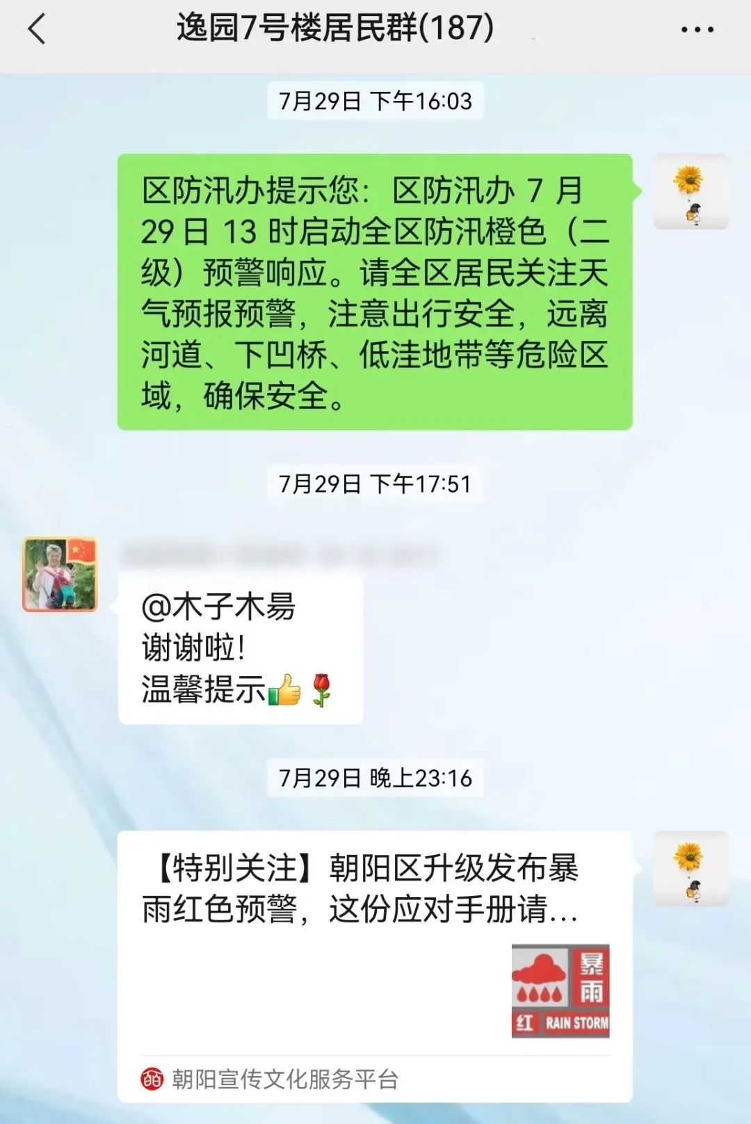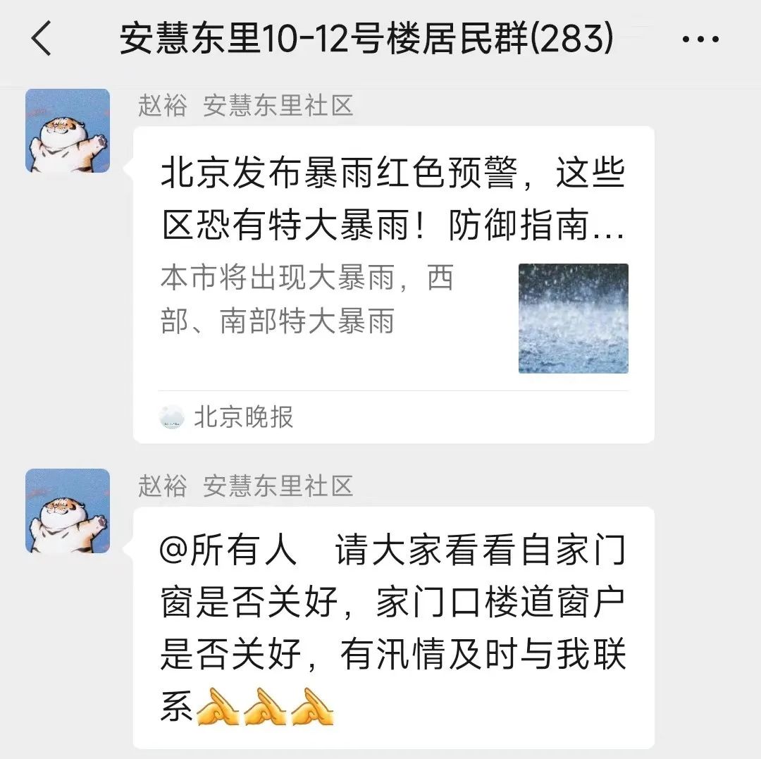 此外,各社区利用微信群、楼内公告、微信公众号等途径宣传普及防汛知识及防护措施,动员居民减少出行,密切关注汛情及预警信息,做好安全防范。