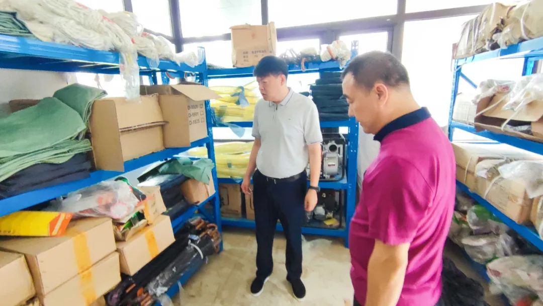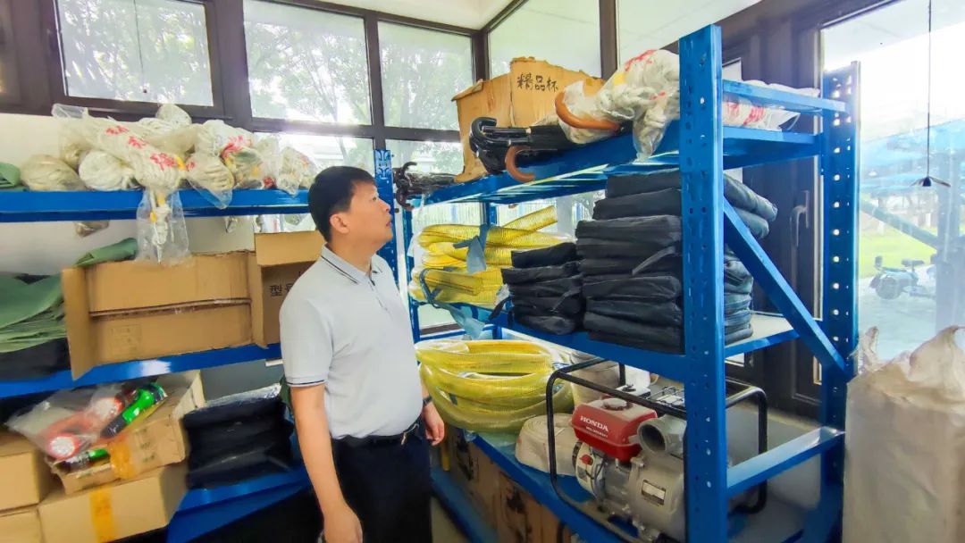 在防汛物资储备室,马利详细了解了我镇防汛工作筹备情况和汛期应急值守落实情况,并详细查看了救生衣、救生圈、救生绳、救生艇、抽水泵等应急物资,对防汛应对工作提出指导意见。