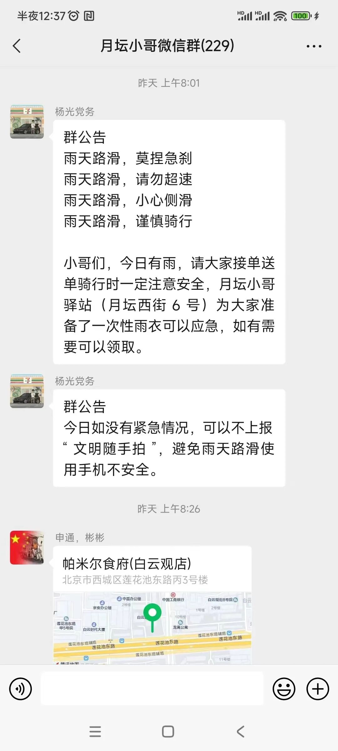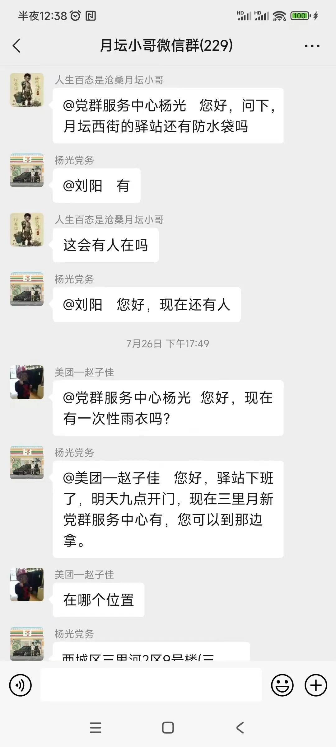 “树倒了,请绕行。”“此处有大片积水。”……依托“文明随手拍”活动,“月坛小哥”在工作途中,及时发现汛情及降雨引发各类环境秩序问题,并在“月坛小哥微信群”上报,相关职责部门及时认领问题并及时处置解决,形成未诉先办。月坛街道党群服务中心还在小哥驿站为快递、外卖从业人员准备了雨衣、防水手机套等物资。