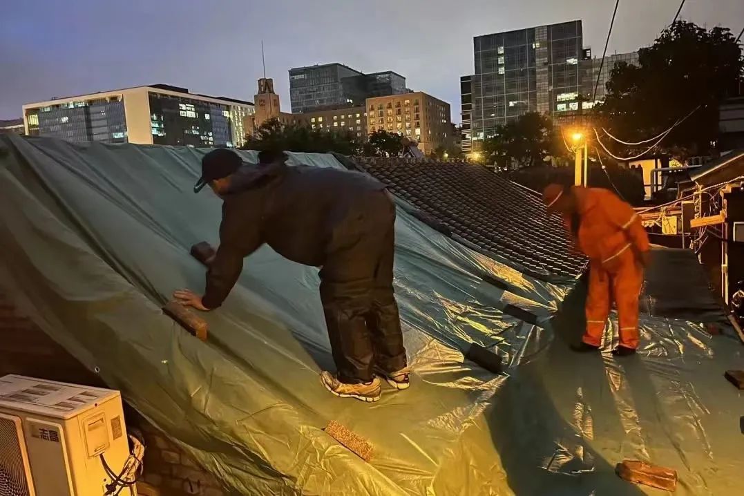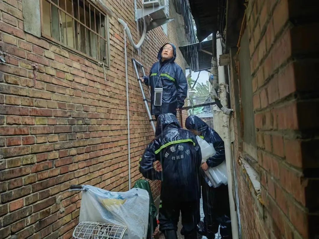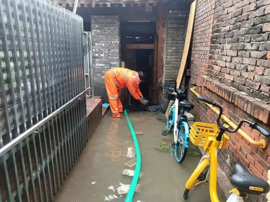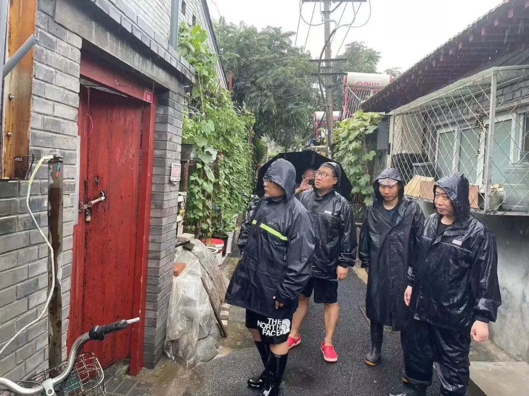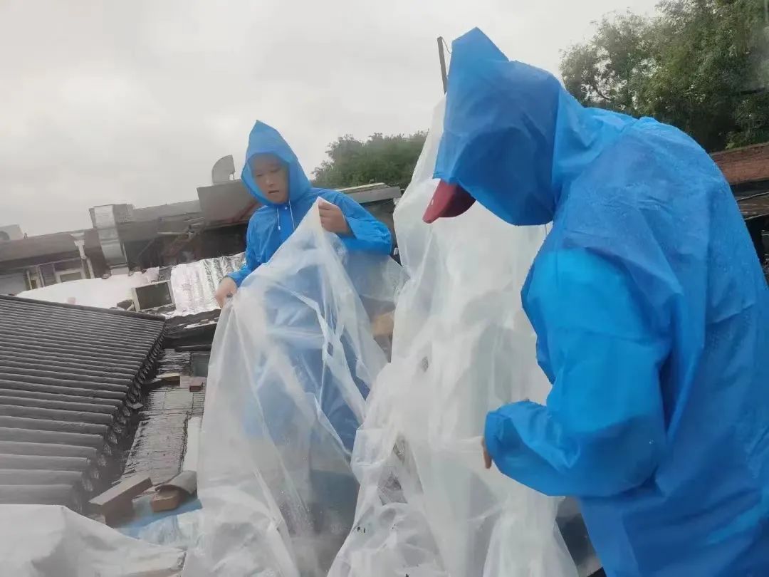 房屋漏雨、地面塌陷、树木倒伏、墙体脱落……雨声就是哨声,险情就是命令。什刹海街道充分发挥“街道吹哨、部门报到”机制,防汛专班迅速协调区房管局、德源集团、什刹海房管所、抢险队等相关部门工作人员,第一时间赶赴现场处置险情,确保人民群众生命财产安全和城市安全。四环胡同7号两处中介半代管的四间私房出现三面严重漏雨的问题,社区工作人员第一时间到达现场查看,并立即上报街道防汛专班,由专班协调应急人员到达现场,商讨解决方案。四环社区党委书记徐军、社区联络员于磊协同应急队员一起为危房苫盖塑料布,以最快速度解决了房屋漏雨问题。