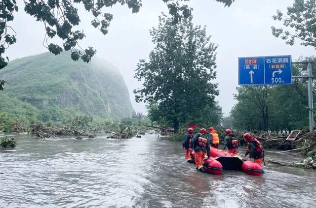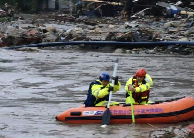 7月31日,石景山消防救援支队接市消防救援总队命令,派出古城消防救援站的三部消防车和两艘舟艇,赶往房山区河北镇磁家务村开展救援。