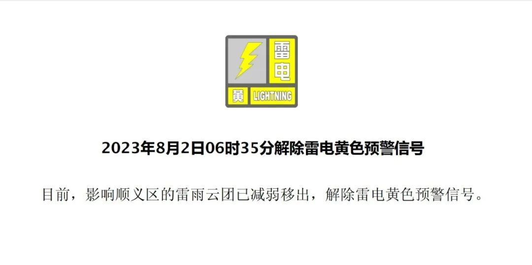 今日(8月2日)06时35分、07时35分,区气象台分别解除雷电黄色、暴雨黄色预警:目前,影响顺义区的雷雨云团已减弱移出,解除雷电黄色预警信号;影响顺义区的强降雨云团已移出,解除暴雨黄色预警信号。