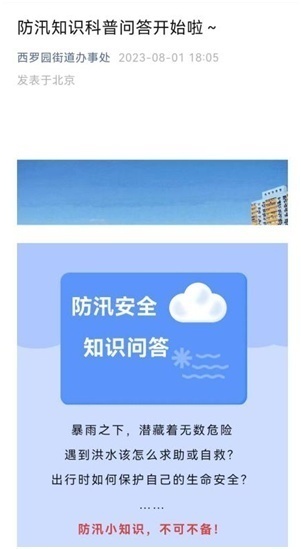 问卷发布后,西罗园街道广泛动员机关干部、辖区单位和社区居民积极参与答题,通过官方公众号、微博客户端、微信群、朋友圈等多个平台进行转发分享,扩大问卷参与率和知识普及率,发布首日参与量就达六千余人次,有效普及了防汛减灾、抢险急救等安全知识,提升群众防灾意识和抗灾能力。