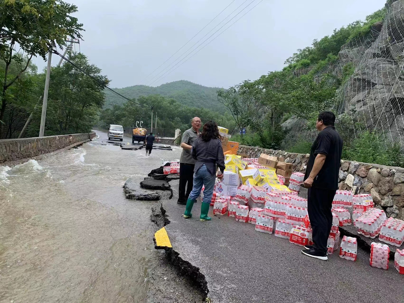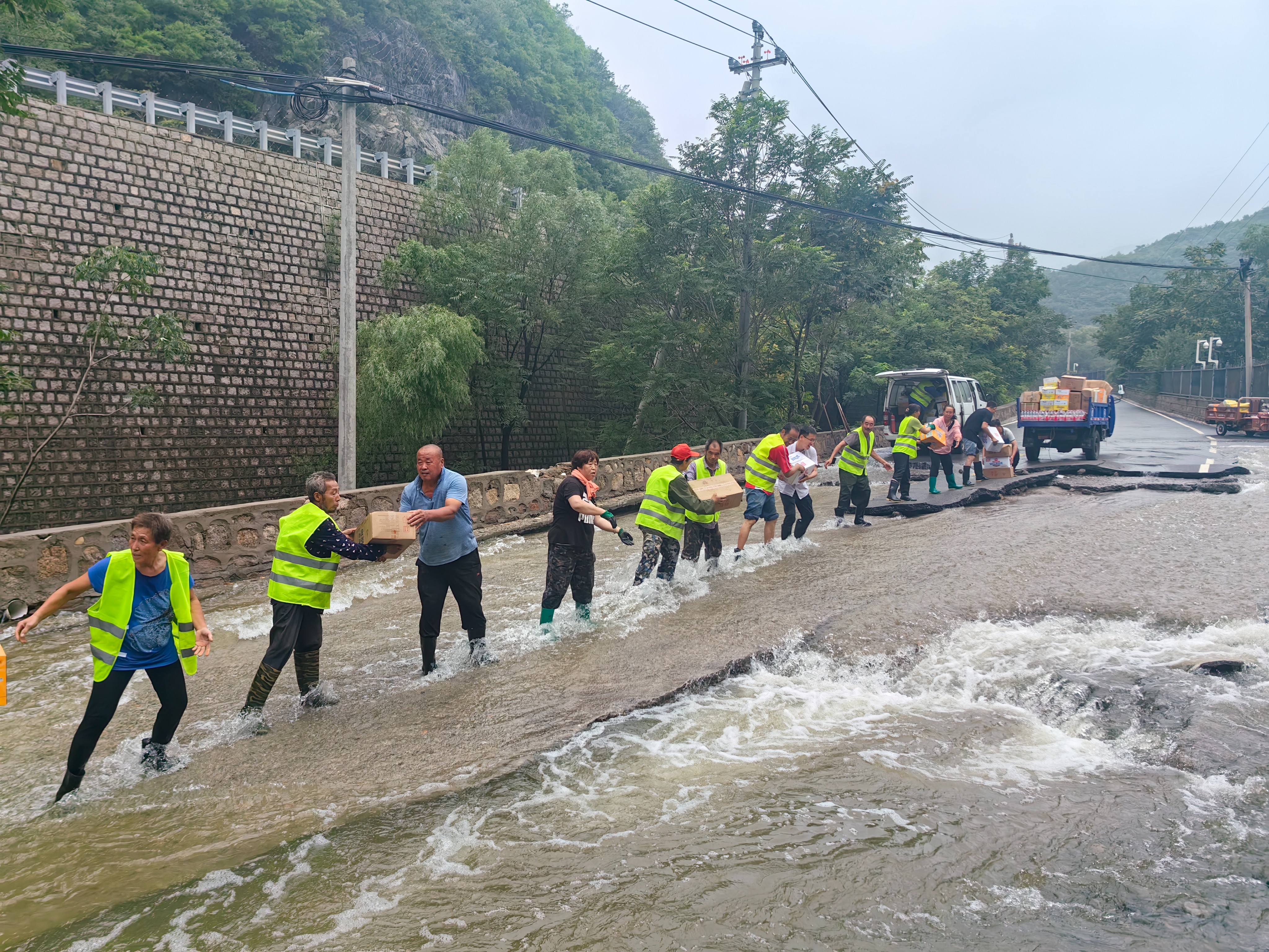 在克服响潭段、龙潭段山体落石影响的情况下,经过多方努力,物资运送车辆被迫停在了村内塌陷路段积水点前。由于车辆无法继续通过,物资只能通过人手相传的方式进行搬运,后经多方力量合力,在水中接力完成物资转运,确保了村委会集中安置点以及各自然村的生活物资供应。
