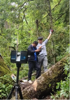 据范光鹏博士介绍,团队做了周密的科考计划,对亚洲第一高树以及周围其他巨树、林分环境展开一系列的科学调查。他们将激光雷达作为“亚洲第一高树”的体重秤,利用激光雷达对亚洲第一高树进行了扫描。在复杂的坡地上架设雷达设备,同时爬过杂乱的灌木草丛去铺设扫描过程中所需要的标靶。