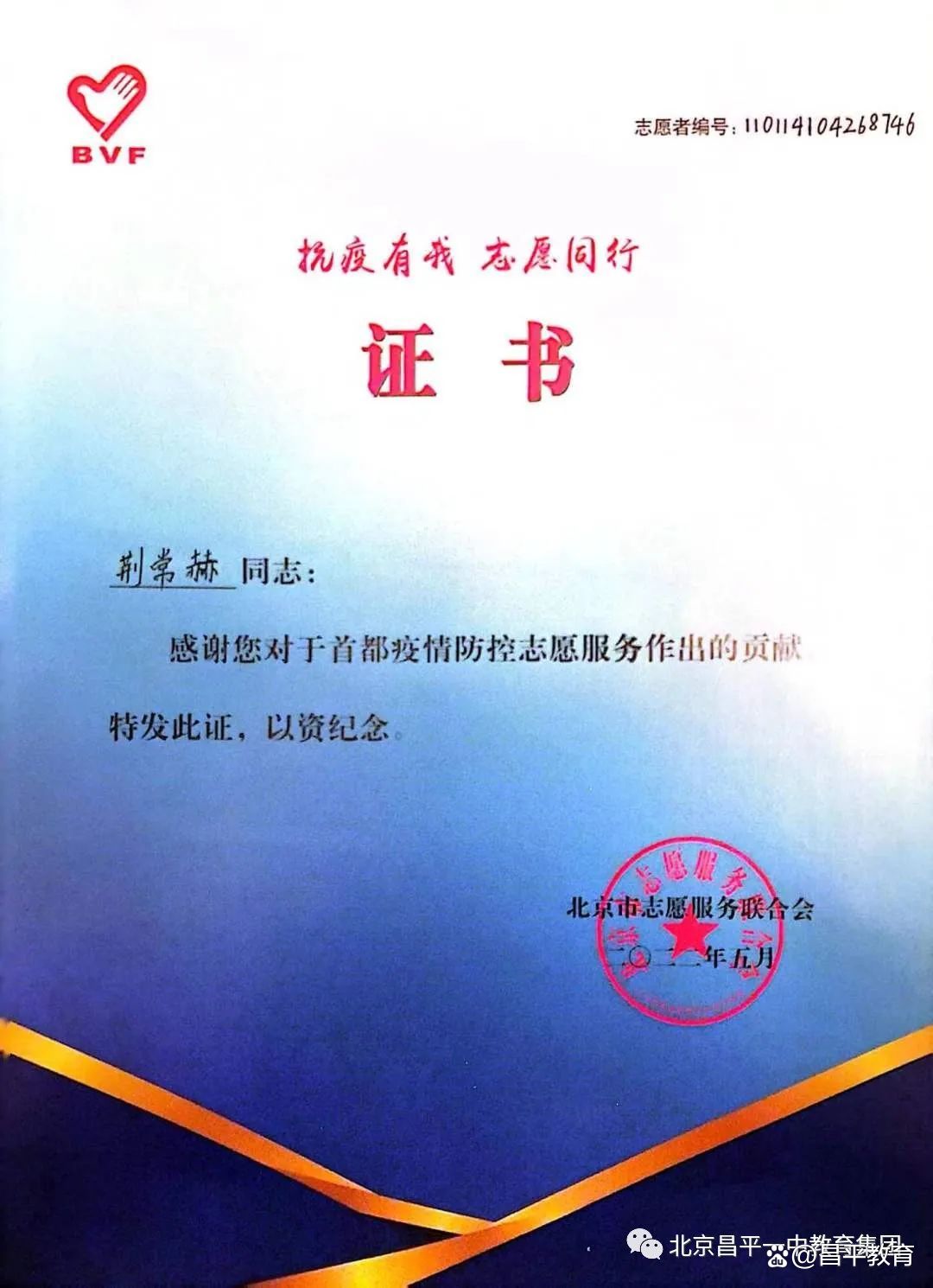 志愿活动有利于丰富学生的生活,拓宽生命的宽度。我在学习之余,会积极参与社区活动,热心各项公益活动。特别是在疫情期间,坚持每周末去社区报到,协助社区的工作人员开展疫情防控工作,受到了社区工作人员及社区居民的一致好评。个人也因此获得了北京市志愿服务联合会颁发的志愿者证书。