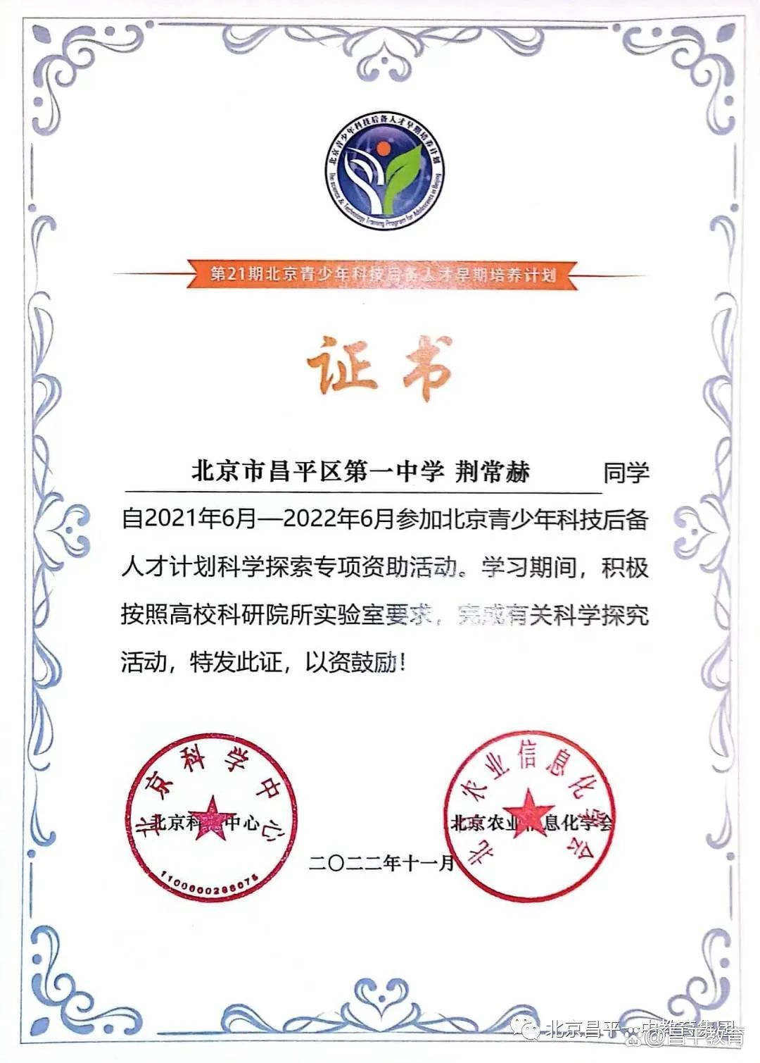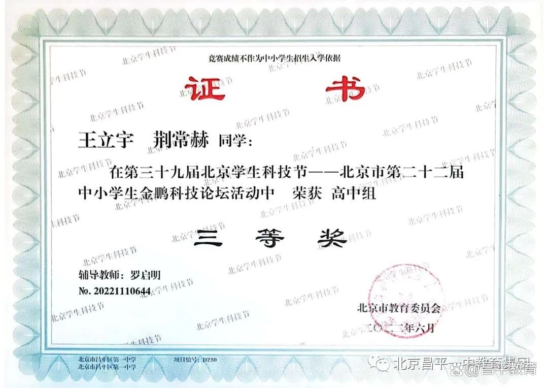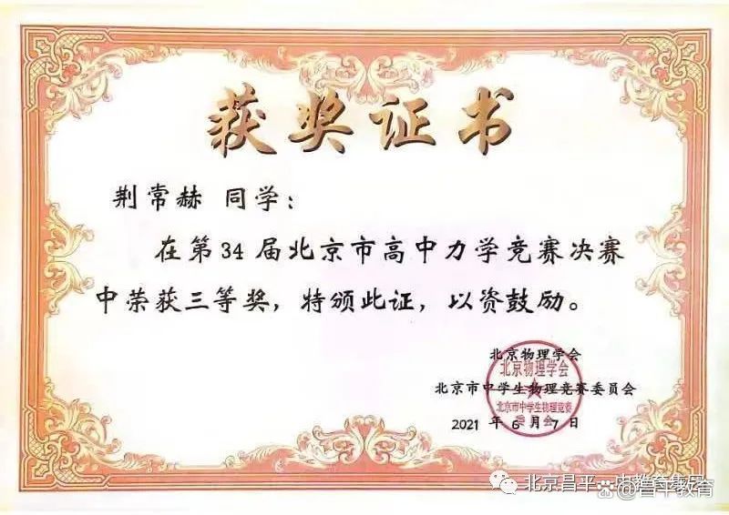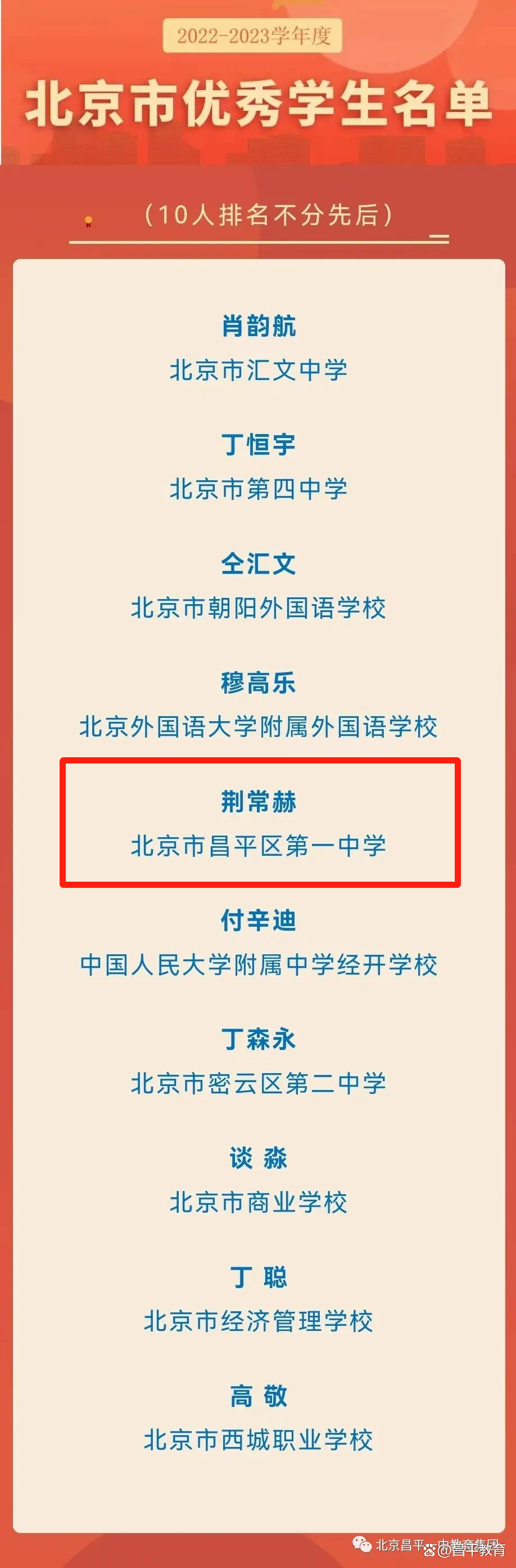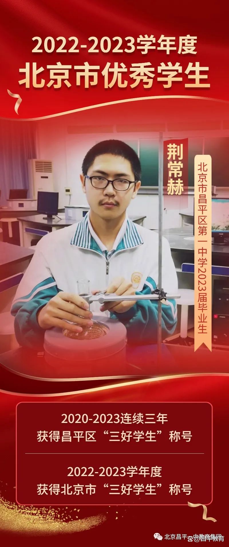 近日,北京市教委官网发布了2022-2023学年度“北京市优秀学生”评选结果,全市仅有10位同学获得了该项荣誉称号,北京市昌平区第一中学2023届毕业生荆常赫同学位列其中。