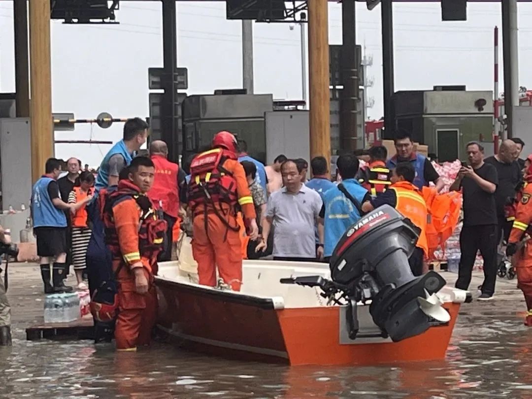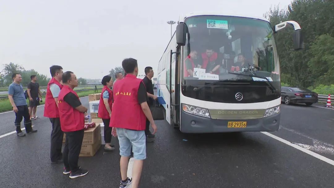 在京港澳高速琉璃河出口,驻守干部、消防官兵、武警战士、公安干警、红十字救援队、蓝天救援队、平安房山志愿服务队等多支救援队伍紧张忙碌,矿泉水、八宝粥、面包等救灾物资均准备就绪。