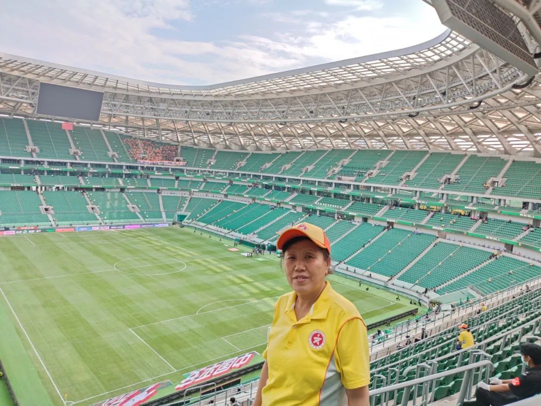 运动员在绿茵场上挥汗如雨、奋力拼搏。李海花和其他引导员一起在绿茵场下,引导球迷们文明观赛。