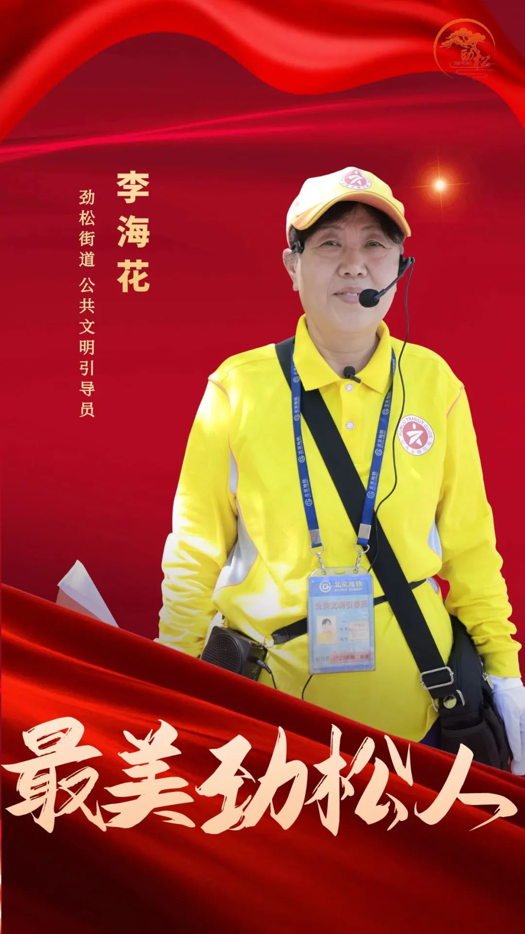 “身穿‘柠檬黄’、腰别扩音器、手拿指挥旗”,不管风雨交加,还是严寒酷暑,在清晨和傍晚繁忙的交通路口、公交站台、地铁站台,我们总能发现一抹抹黄色的身影,他们就是劲松街道公共文明引导员。李海花便是其中一员,作为59岁的她加入引导员队伍已经第九个年头了,目前是公共文明引导员劲松中队队长,也是北京市二星级引导员。九年来,她一直用自己的行动传递文明新风,让“礼让守序”的意识深入人心。