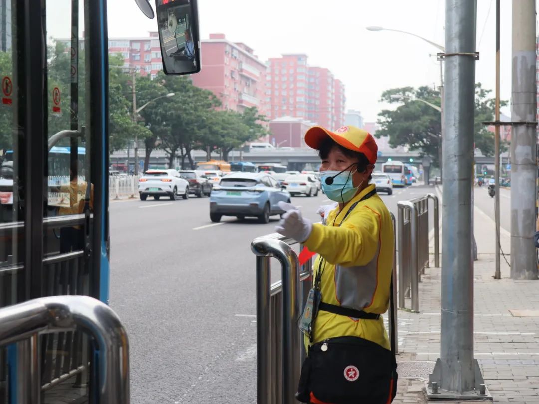除了引导乘客文明有序乘车,李海花的工作包括帮助乘客指路,搀扶有需要的人群过马路,引导行人车辆通行。之前一位老人站在马路中间许久,不时左顾右盼准备过马路,但来往车辆不断,老人有些不知所措。这一幕刚好被李海花看到,她快步向前走过去,搀扶老人到安全区域,得到了老人连连称赞。