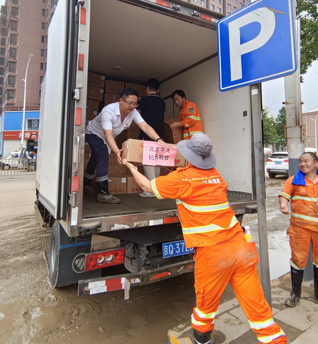 8月3日早晨,一辆装载着北京华天抗汛物资的运输车自西城区驶向门头沟区,为辛苦奋战在一线进行清理作业的环卫工人提供餐食补给。