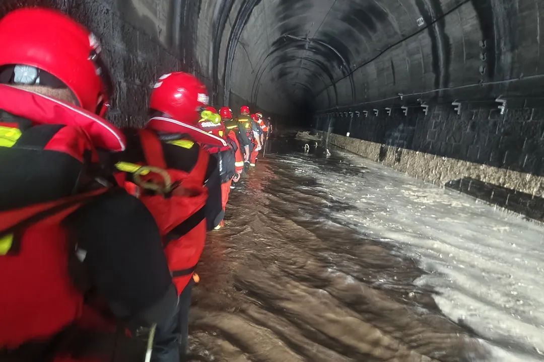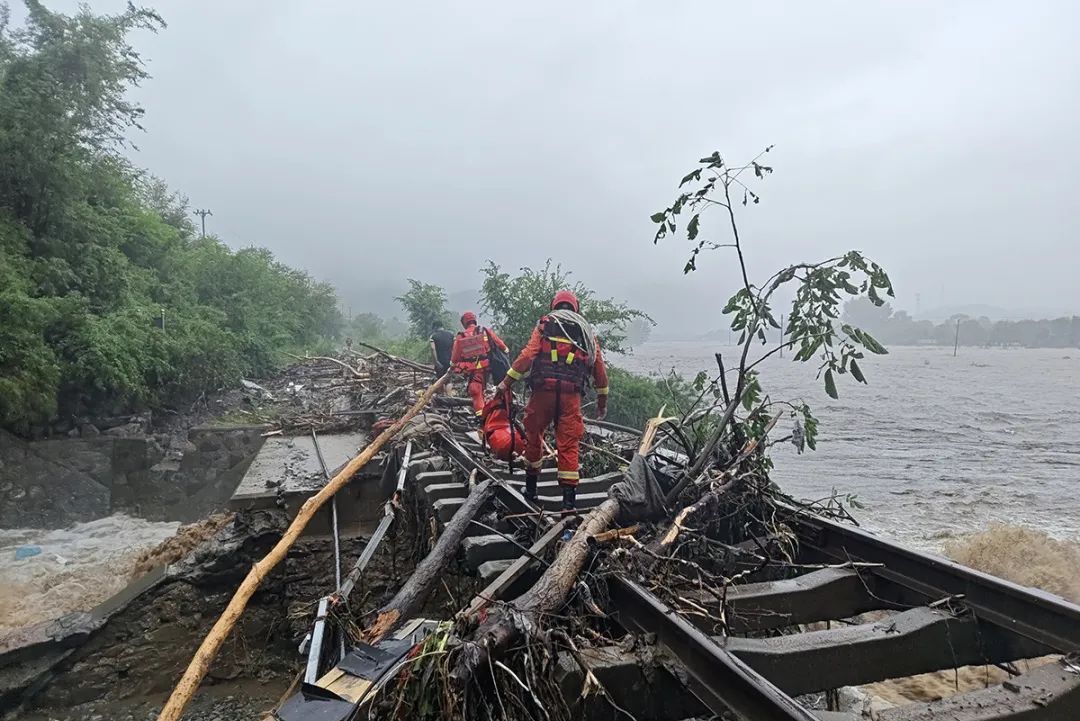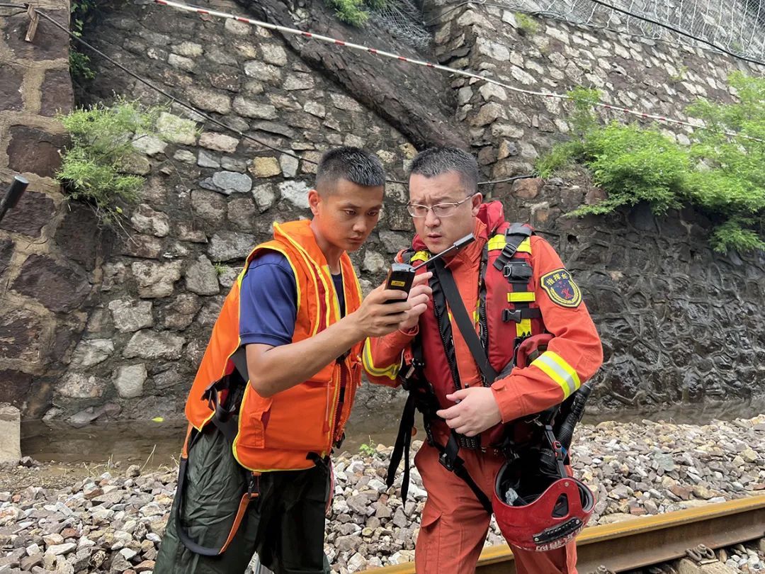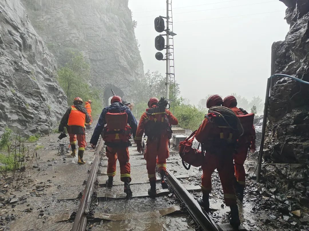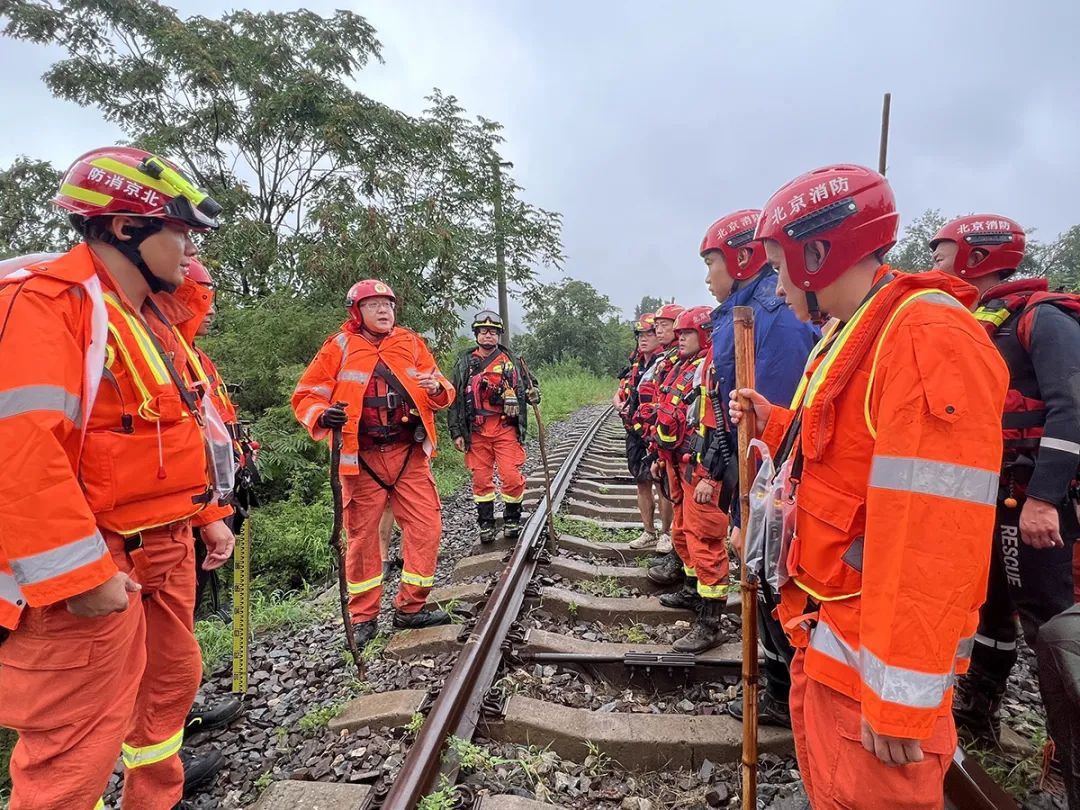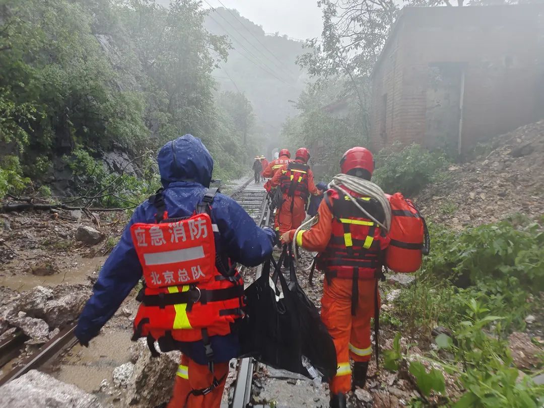 受灾区域环境复杂,水文路况信息不明,但时间不等人,必须尽快打通救援通道!8月1日上午11时,第一突击梯队的顺义消防队员背负轻便救援装备和紧急物资,立即从丰沙线斜河涧站沿铁路线徒步向两辆列车被困区域挺进,开展第一现场侦察救援。