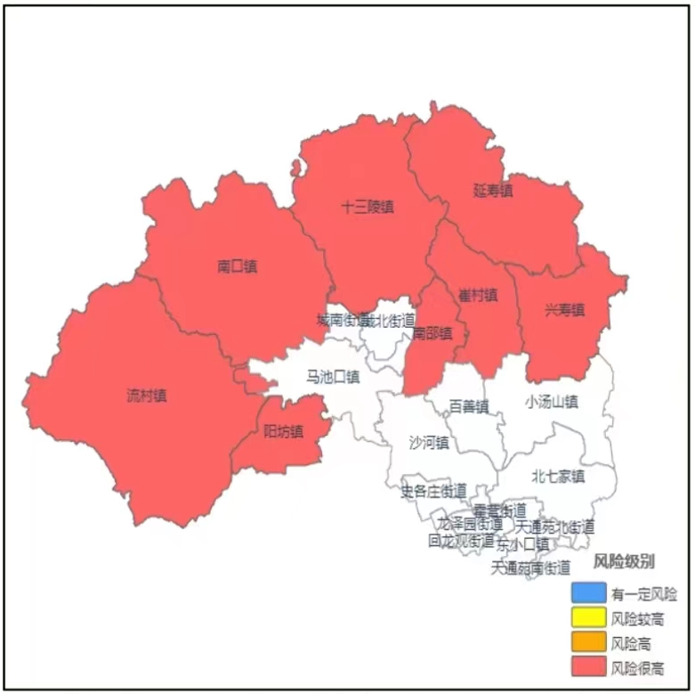 市规划自然资源委昌平分局、昌平气象局联合发布地质灾害气象风险红色预警。未来48小时,昌平区流村镇、南口镇、十三陵镇、延寿镇、兴寿镇、崔村镇、南邵镇、阳坊镇发生滑坡、崩塌等地质灾害的风险很高,特发布地质灾害气象风险红色预警,请注意防范。