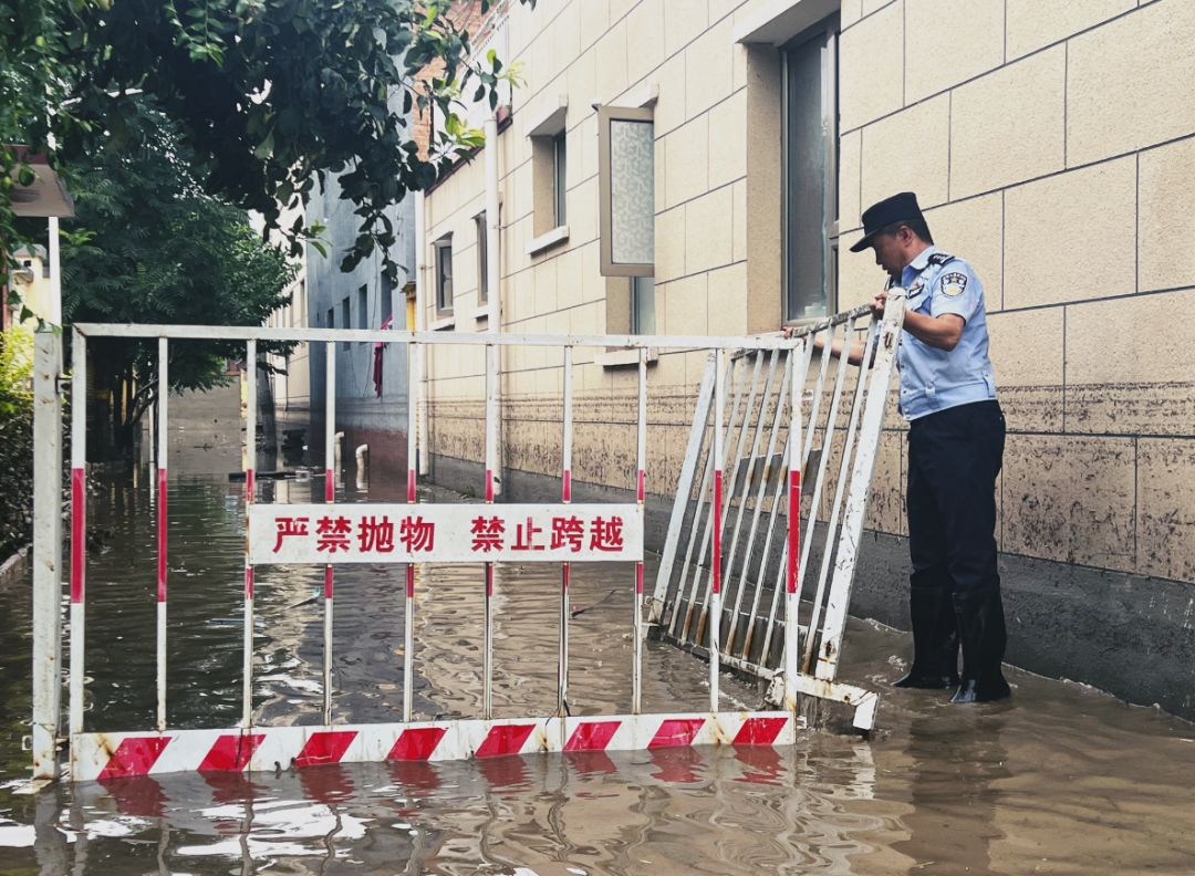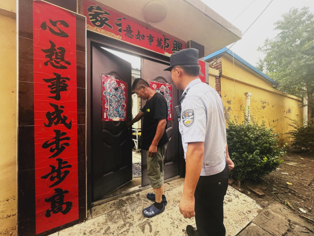蹚着积水,姚谞和周刚在村里挨家挨户巡查。“村民转移之后,我们派出所的主要工作就是治安巡控,每天都会安排民警进村巡查,走访没有转移走的居民,及时了解需求提供帮助;查看被水浸泡的民房,防止发生坍塌危险;劝退个别不顾危险要回家的村民,保证百姓生命安全;还要组织联防队昼夜巡逻,防止不法分子悄悄进村作案,对百姓造成二次伤害。”