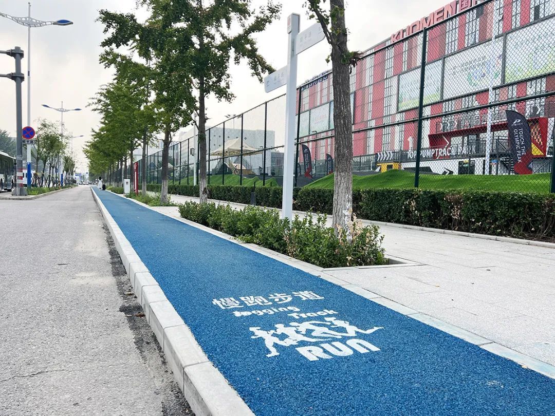 后沙峪镇“两街”综合治理提升工程于2022年12月中旬启动,包含路面拆除、给水管线铺设、路面铺装、绿化种植、城市家具安装等,其中顺平路改造提升长度2.1公里,双裕街改造提升长度1.6公里,均增设了1.5米宽的健康慢跑步道系统。在步道选材上,人行步道路面采用透水砖铺装和石材铺装,慢跑步道采用彩色透水沥青混凝土面层,具备美观、透水性好等特点,还能更好地保护慢跑者的膝盖、脚踝等部位,减少运动损伤。