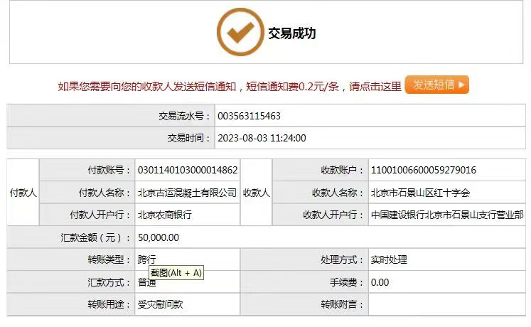 会员企业北京古运混凝土有限公司通过北京市石景山区红十字会向石景山区模式口、麻峪等房屋被淹居民群众捐款50000元,用于购置被褥、矿泉水、方便食品等生活物资。