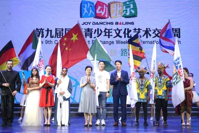 北京市人民对外友好协会、北京演出行业协会、中国文学艺术基金会校园文化专项基金领导为国际团队授旗。各国青少年身着代表性的民族服装,手持各国国旗,歌载舞地从舞台四面八方涌入舞台中央,在《相亲相爱》的音乐声中开启了一场青春与友谊的盛会!