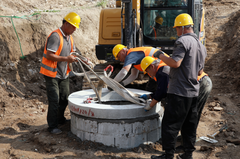 挖管线沟槽、测量沟深、平整土地、苫盖防尘网……位于延庆镇的世园会交通市政配套工程定向安置房项目已进入小市政工程及配套道路施工阶段。施工现场,伴随着挖掘机的轰鸣声,施工人员紧张有序地忙碌着。与此同时,在康庄镇大王庄村回迁房西侧的晨光街,工人正在修建排水井,现场一派繁忙的景象。