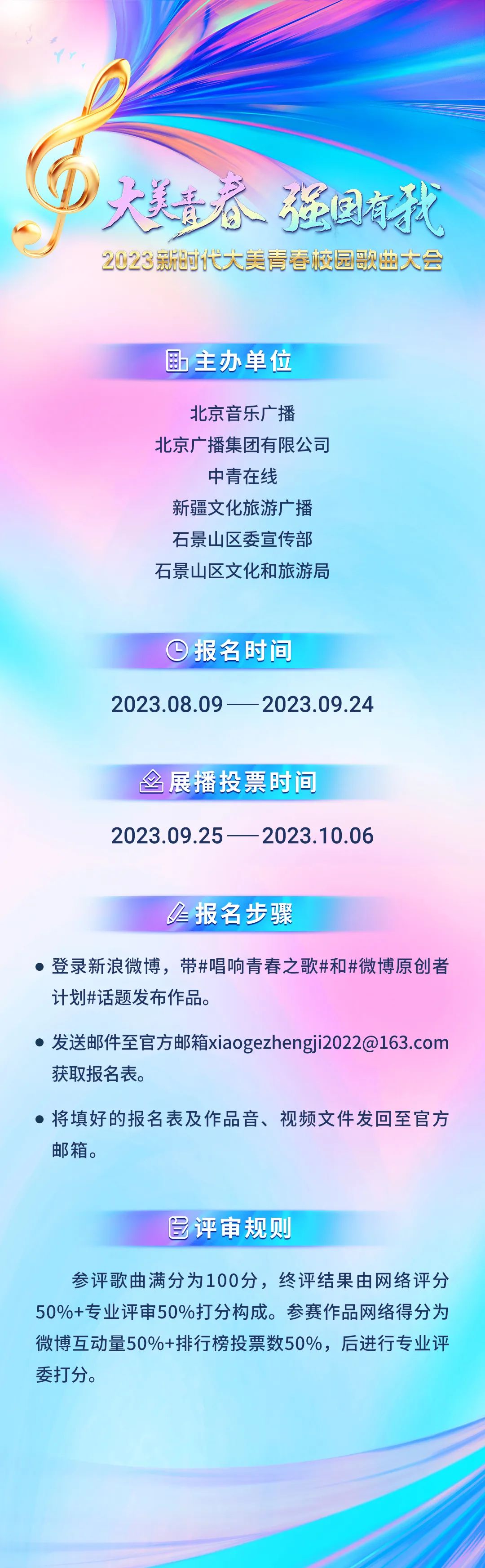 8月9日,2023新时代大美青春校园歌曲大会在微博校园主话题页#唱响青春之歌#正式开始启动报名展播。校歌会由北京广播集团、中青在线、北京音乐广播、新疆文化旅游广播、石景山区委宣传部、石景山区文化和旅游局共同主办,以“大美青春、强国有我”为主题,向全网征集十大原创校园歌曲。北京市关心下一代工作委员会、新疆关心下一代工作委员会、中国青年报社、共青团北京市委、北京市教育委员会、新疆维吾尔自治区委员会教育工作委员会、北京市人民政府台湾事务办公室、北京市石景山区人民政府、北京广播电视台、新疆广播电视台共同指导校歌会活动开展。校歌会是北京市委宣传部“京彩文化 青春绽放”行动计划的有益补充,对于促进首都高校大学生参与全国文化中心建设,特别是以创作演唱原创校园歌曲的方式打造“大戏看北京”文化名片具有积极的推动作用。