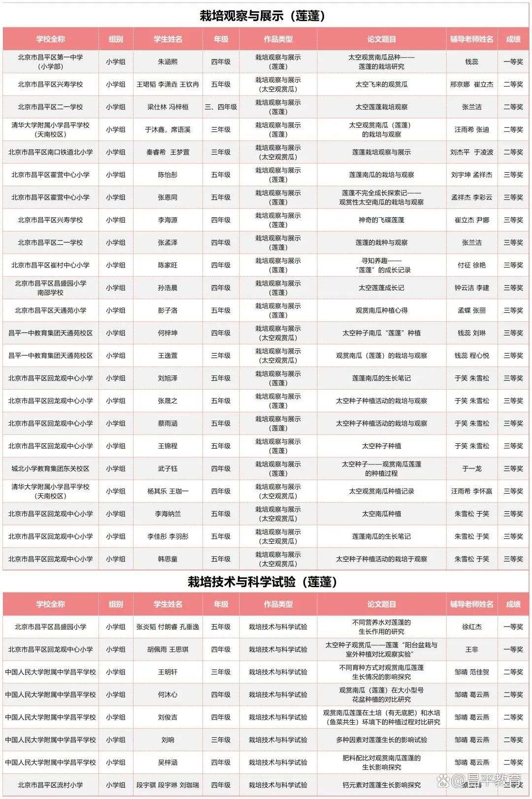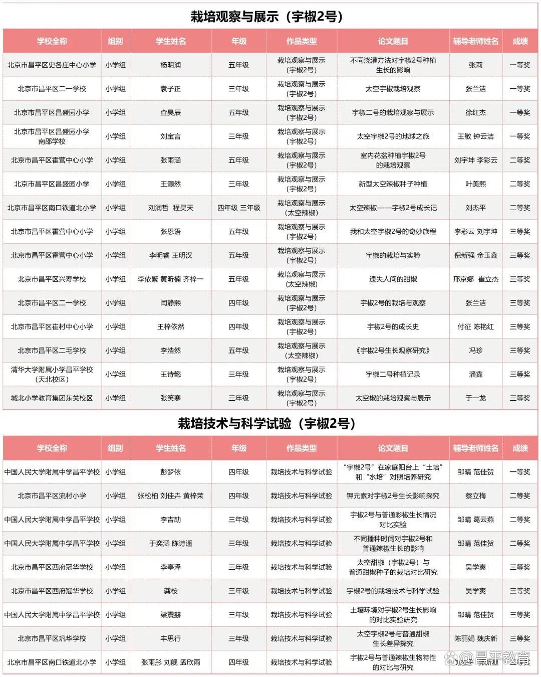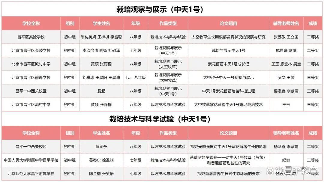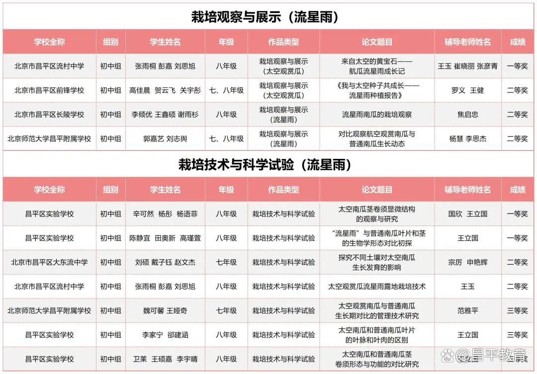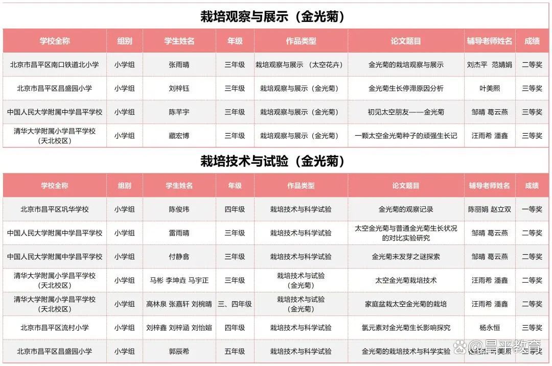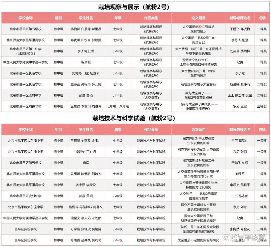 2023年2月中旬,来自昌平区45所学校的1470名学生报名领取了太空种子。6月下旬,昌平区29所学校200余名学生报名参加了市赛。7月16日,经过市级现场赛的激烈角逐,最终,昌平区20余所学校的188名学生获得了市级一二三等奖。