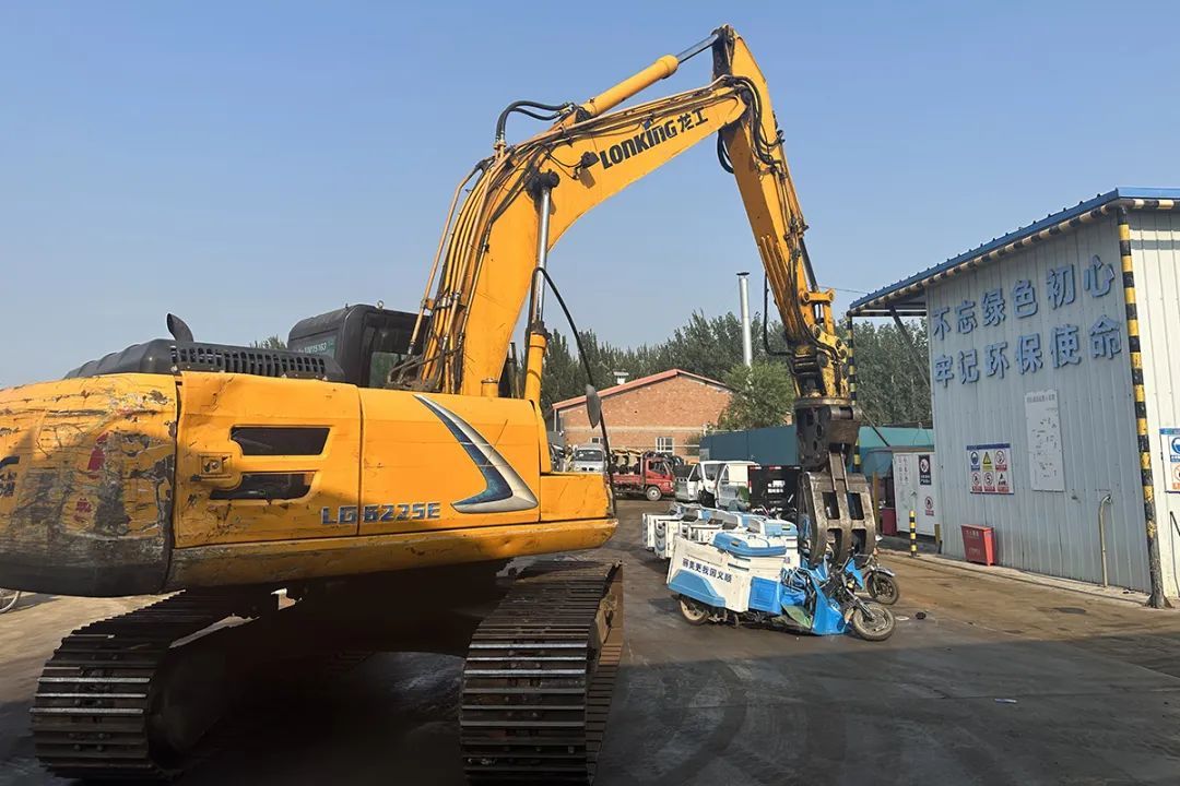 北京华新凯业物资再生有限公司内工作人员操作机械拆解淘汰的电动三轮车。