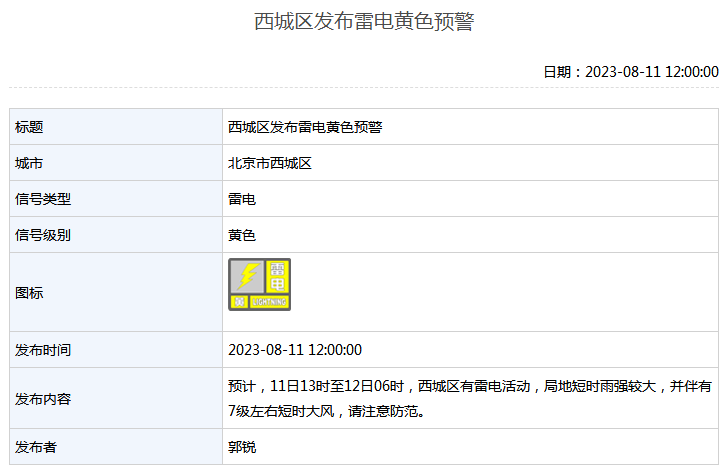 西城区2023年08月11日12时00分发布雷电黄色预警: