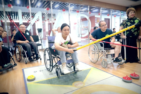 当天,在专业教练员的帮助指导下,参加活动的残疾人选手们逐渐掌握了旱地冰壶的比赛规则和基本技巧。进入到比赛环节,选手们热情高涨,气氛火热。只见他们一一上场,瞄准赛道圆心的位置,凝神屏气,手执冰壶,压低身体,瞄准、蓄力、掷出,动作一气呵成。