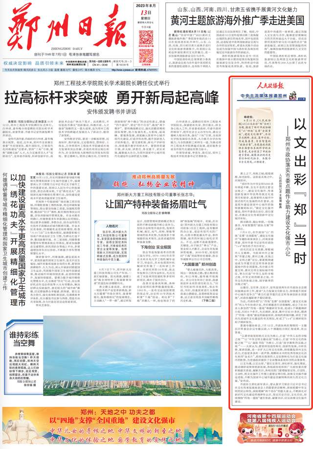 8月11日,《人民政协报》以《以文出彩“郑”当时》为题,报道了郑州市政协锚定“以‘四地’支撑‘全国重地’,建设文化强市”,历经多次调研、座谈、集中讨论,形成集委员、专家智慧的“政协方案”,为党委政府提供全面整体系统科学的决策参考,充分彰显了市政协建言资政、凝聚共识的历史责任和时代担当。本报今日全文转发,以飨读者。