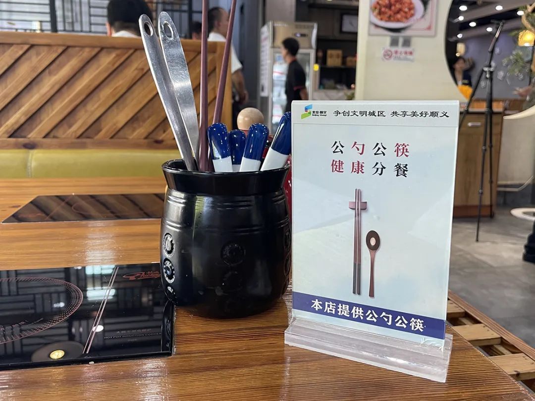 餐桌上的公勺公筷和提示牌摆放整齐。