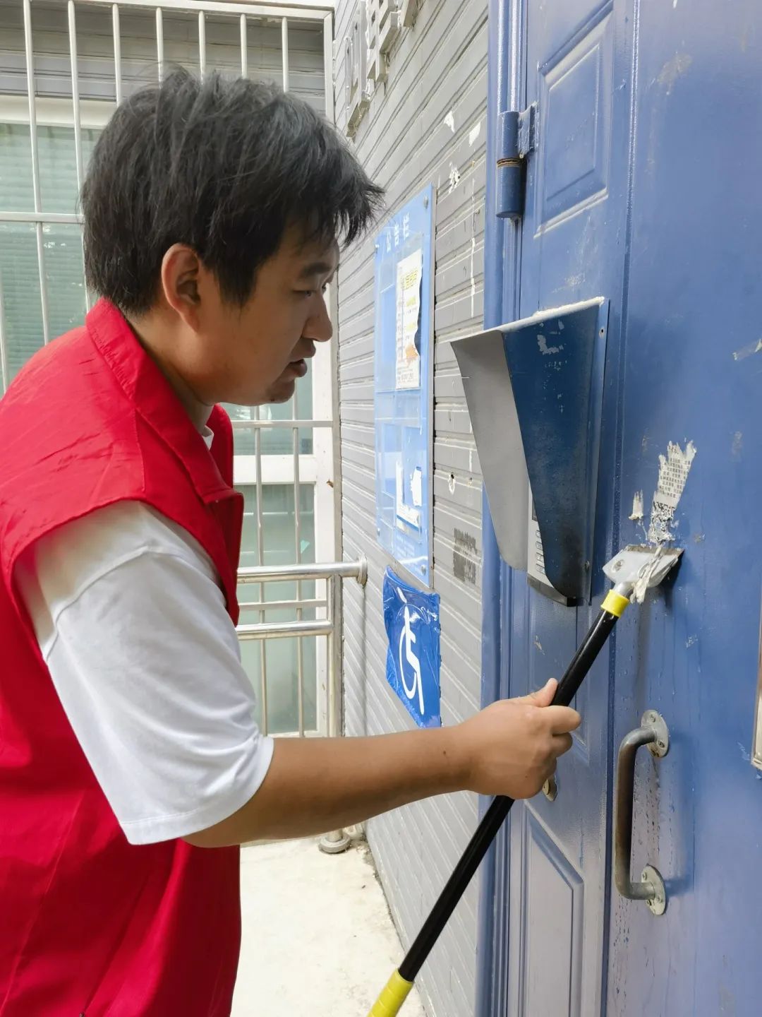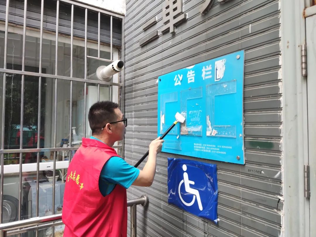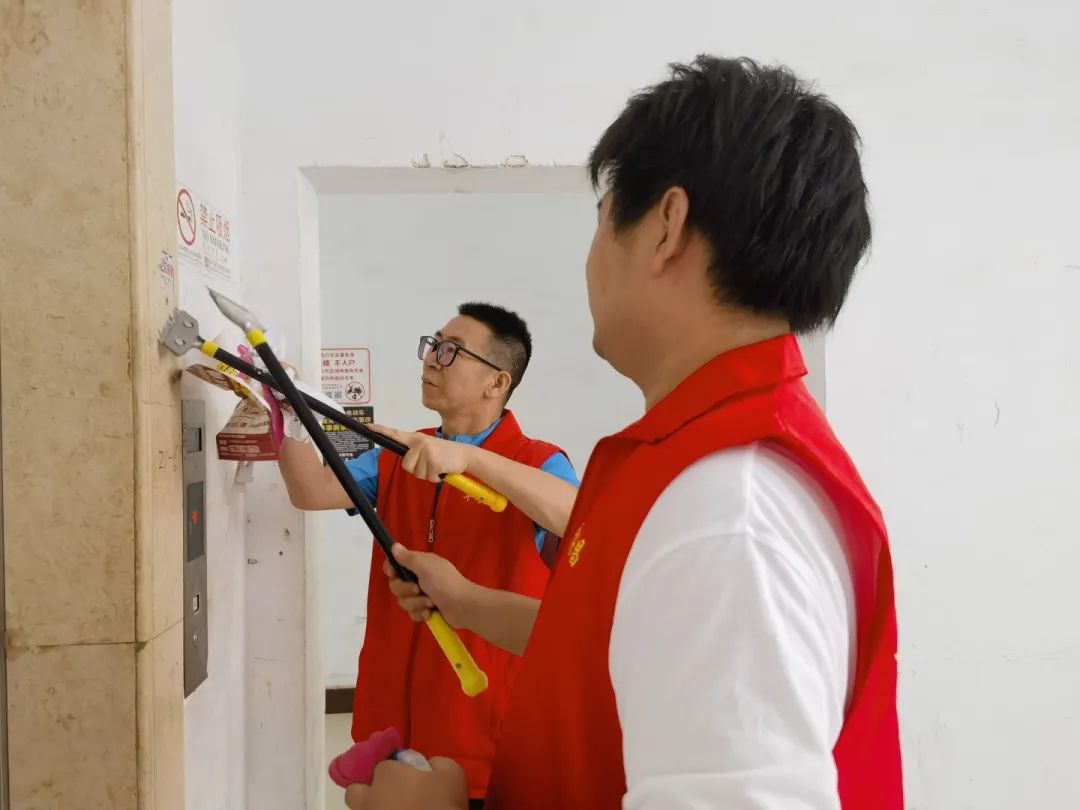 烈日炎炎下,志愿者们带着小铲子、小喷壶、抹布等工具,对小区单元门、楼梯墙面、公共设施上的小广告进行清理。