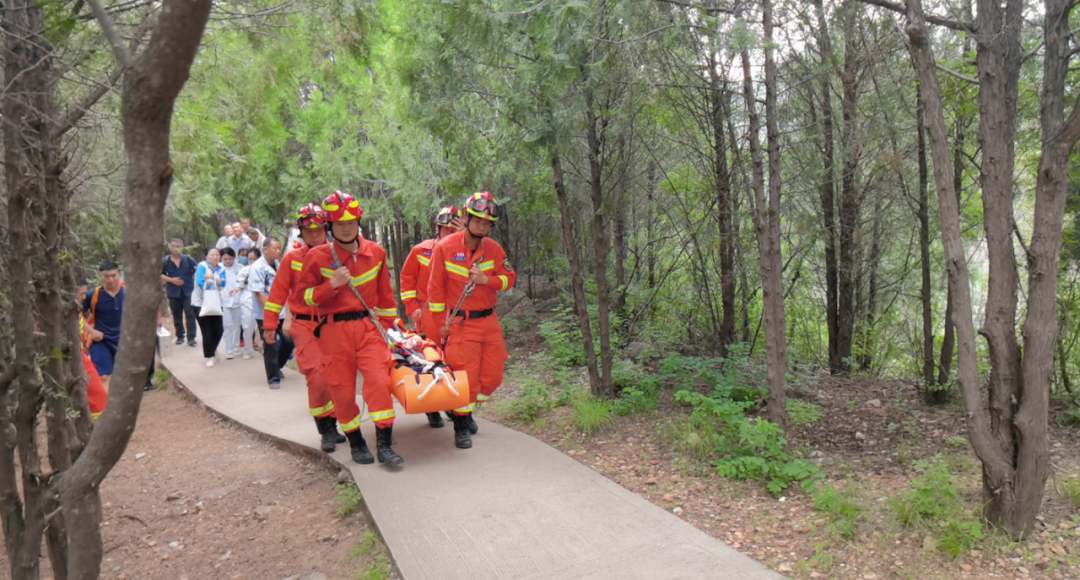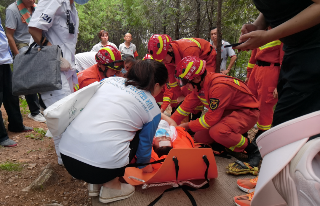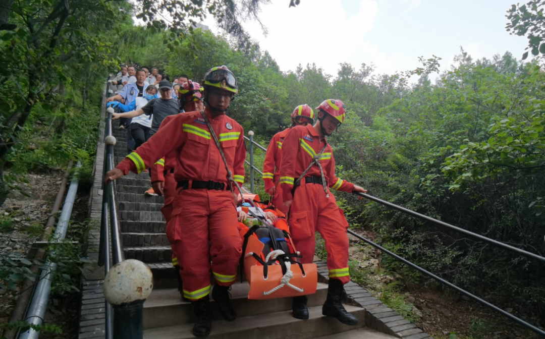 昨天中午,怀柔区消防救援支队接到报警:一游客在游览某景区途中,晕倒被困山顶,接警后,救援人员迅速出动,携带救援器材、医用药品赶赴现场。
