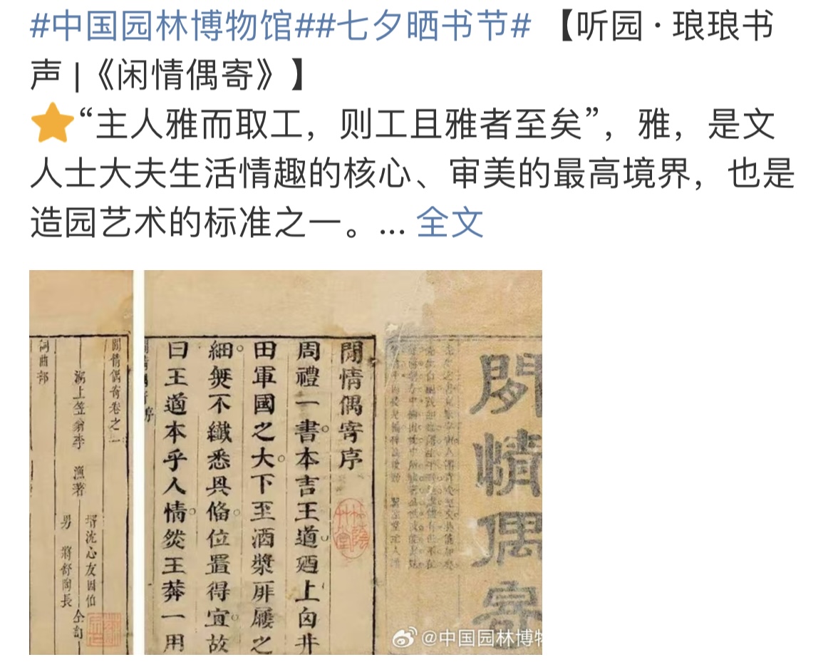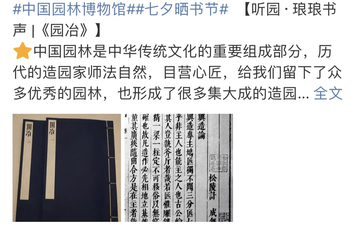 园博馆在线上发起“七夕晒书节”活动!古代七夕的晒书传统到了现代,又衍生出了“分享”的含义,浪漫的节日里正适合阅读经典,欢迎大家“晒”出自己家中的园林经典,@中国园林博物馆 官方微博,与我们分享你与阅读与园林的故事。