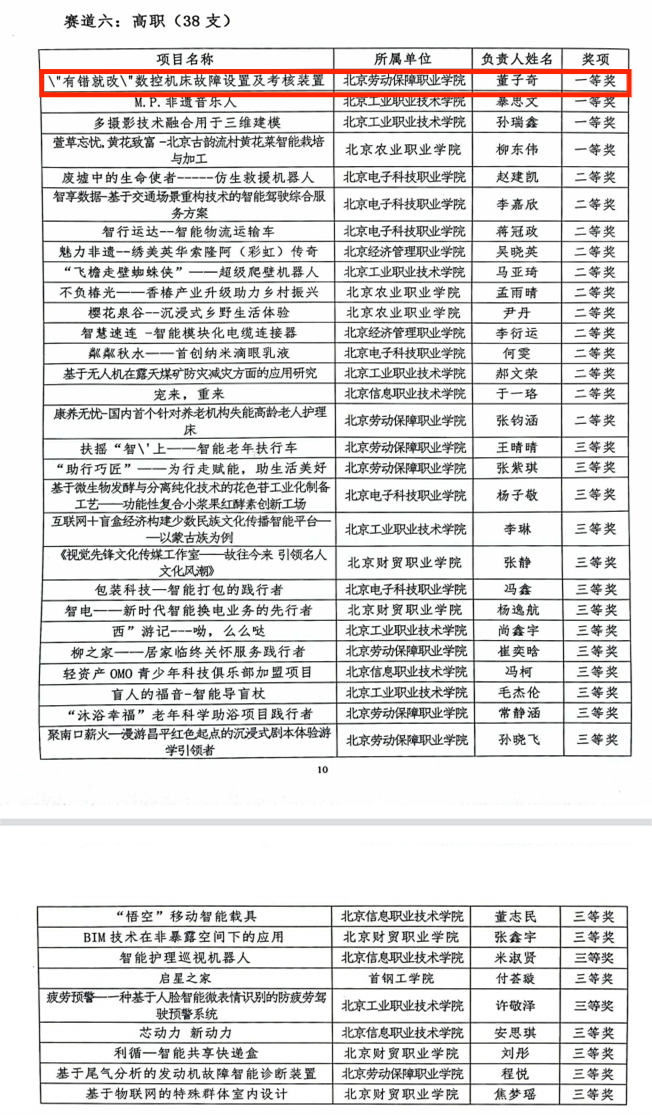 近日,北京市教育委员会、北京高校大学生就业创业中心公布了第二届“京彩大创”北京大学生创新创业大赛分赛道现场决赛获奖名单,由我院城市安全学院罗英俊、张军老师指导、董子奇(22机电4班)同学负责的“‘有错就改’数控机床故障设置及考核装置”项目获得一等奖第一名。