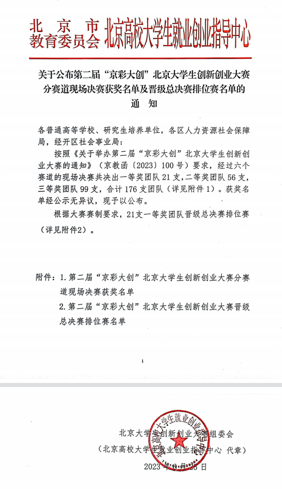 第二届“京彩大创”北京大学生创新创业大赛由北京市教委、北京市人力资源社会保障局和北京市发展改革委共同主办,北京高校大学生就业创业指导中心承办。大赛深入落实《国务院办公厅关于进一步支持大学生创新创业的指导意见》《北京市人民政府办公厅关于印发〈北京市支持高校毕业生就业创业若干措施〉的通知》等文件要求,推动“大众创业、万众创新”时代号角唱响京华大地,为青年学子创新创业、追求梦想、实现价值搭建精彩舞台,促进高校毕业生实现更高质量的创业就业。