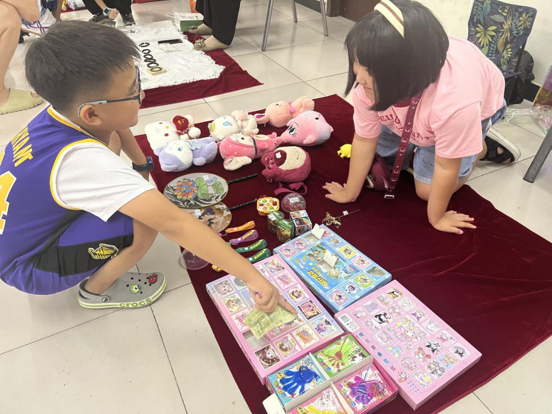 兴宇社区龙湖东区的樱花大道,20余户家庭早早来到活动现场,将旧书、文具、毛绒玩具、手工艺品等物品一一摆放出来。各个小摊主很快进入小老板的角色,开始大声吆喝做起了小买卖,现场热闹非凡。